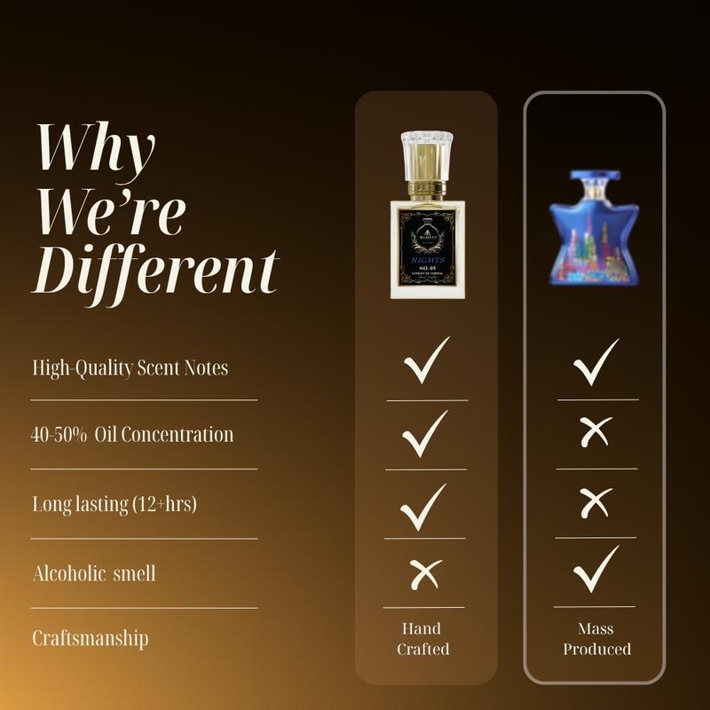 Indulge in the captivating aroma of Nights, an inspiration of New York Nights, with a 50% oil concentrated base that lasts 8-10 hours on skin and clothing. This is a sophisticated mens scent that evolves from luminous blossoms into warm woods and finishes with bold gourmand touches, capturing the energy and glow of Manhattan after dark — making it perfect for evening occasions and moments you want to leaving an impression.