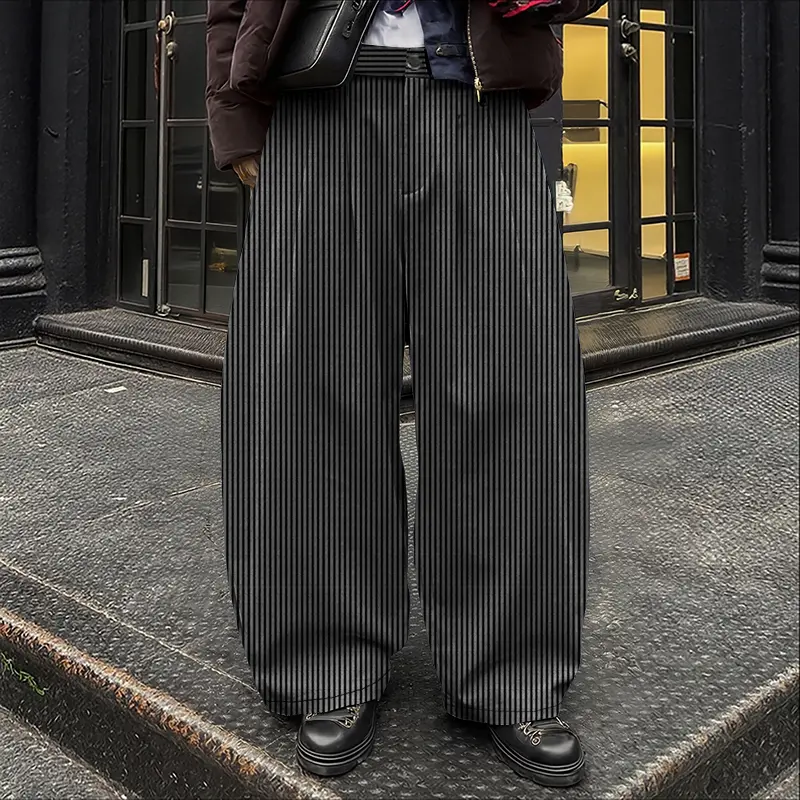 ·The image showcases the trousers in a casual setting, highlighting the wide-leg design and pinstripes.