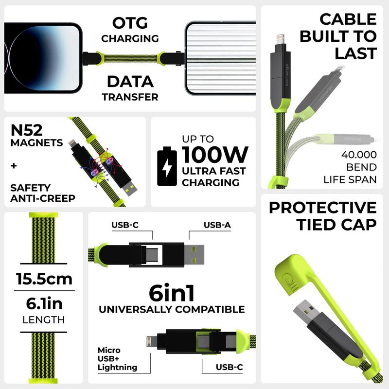 inCharge XL Pocket - 6in1 keyring cable, 100W Fast-charging cable for iPhone, iPad, Android, Laptop, and More (Micro USB, Lightning, DUAL, USB-C devices)