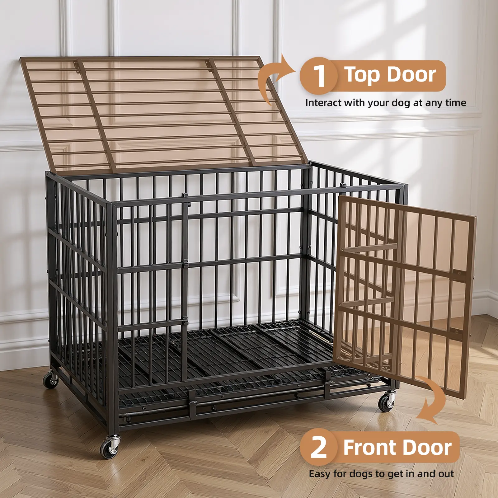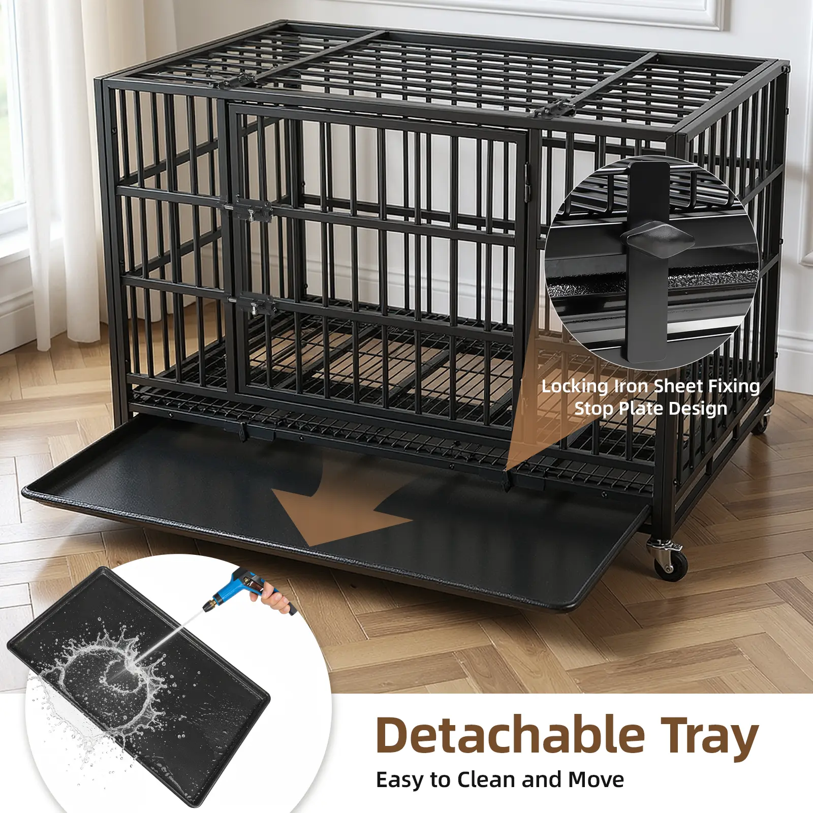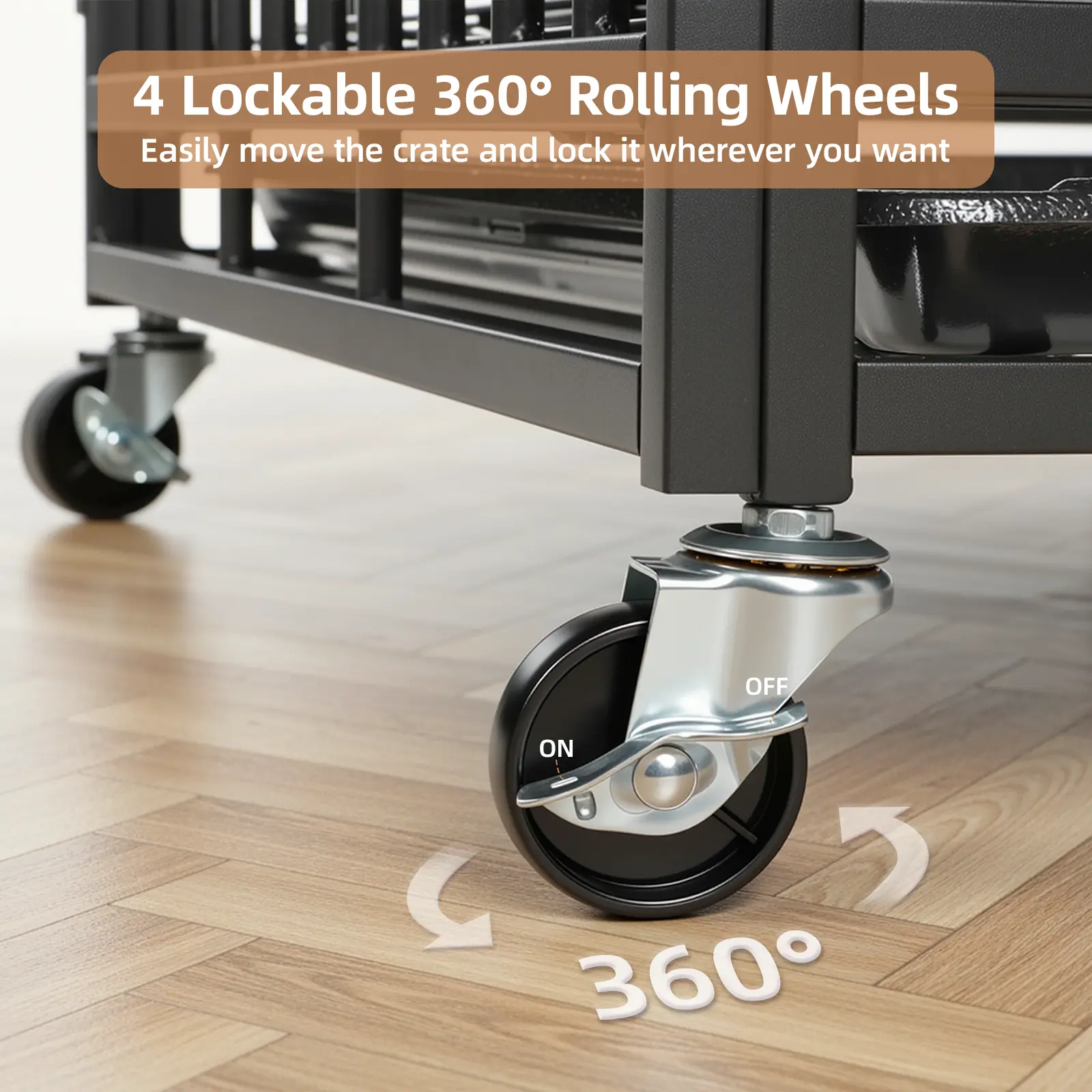 【Flexible Movement】: Come with four high-quality 360° rolling casters, this heavy duty dog kennel can move effortlessly to any place—easier than traditional dog cages. All wheels can be locked to prevent anxious dogs from escaping or harming themselves.