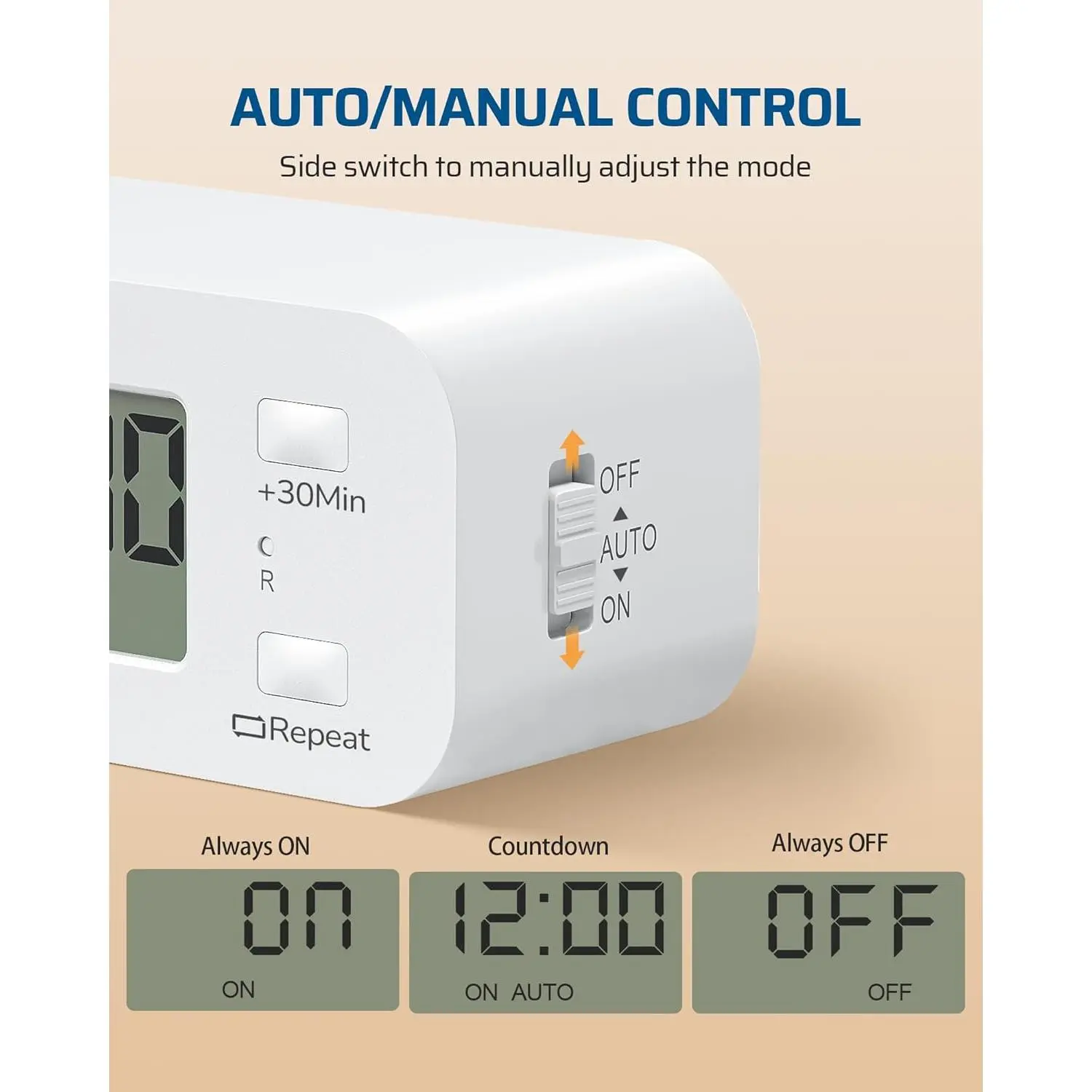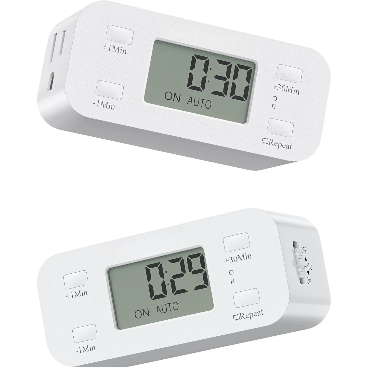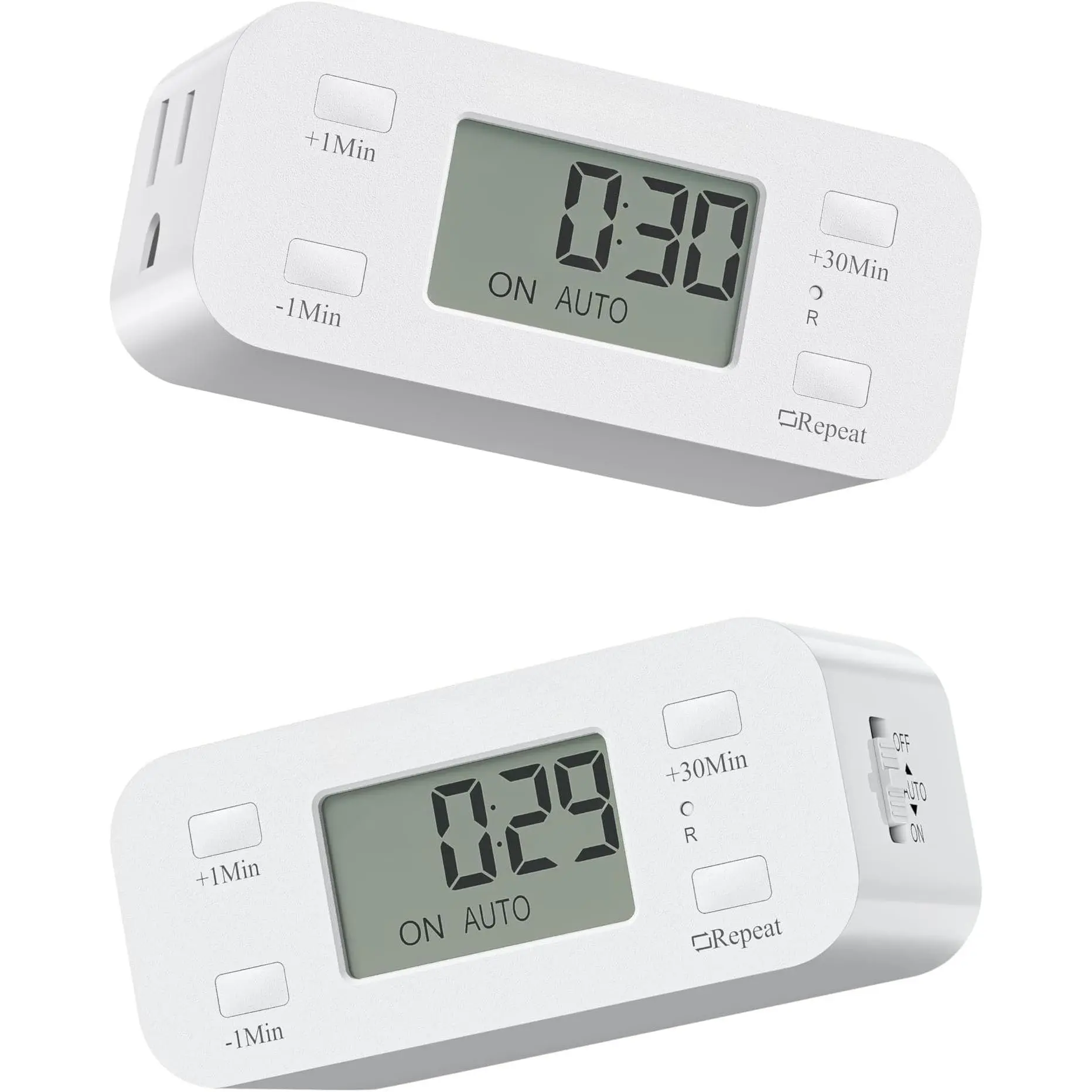 This is a countdown-only timer with no clock display; easily set Always , Always Off, or Auto Mode with the side . Adjust the countdown duration up to 20 hours using "+1min", "-1min", and "+30min" buttons; flexible and convenient to meet your needs without any complex operations.