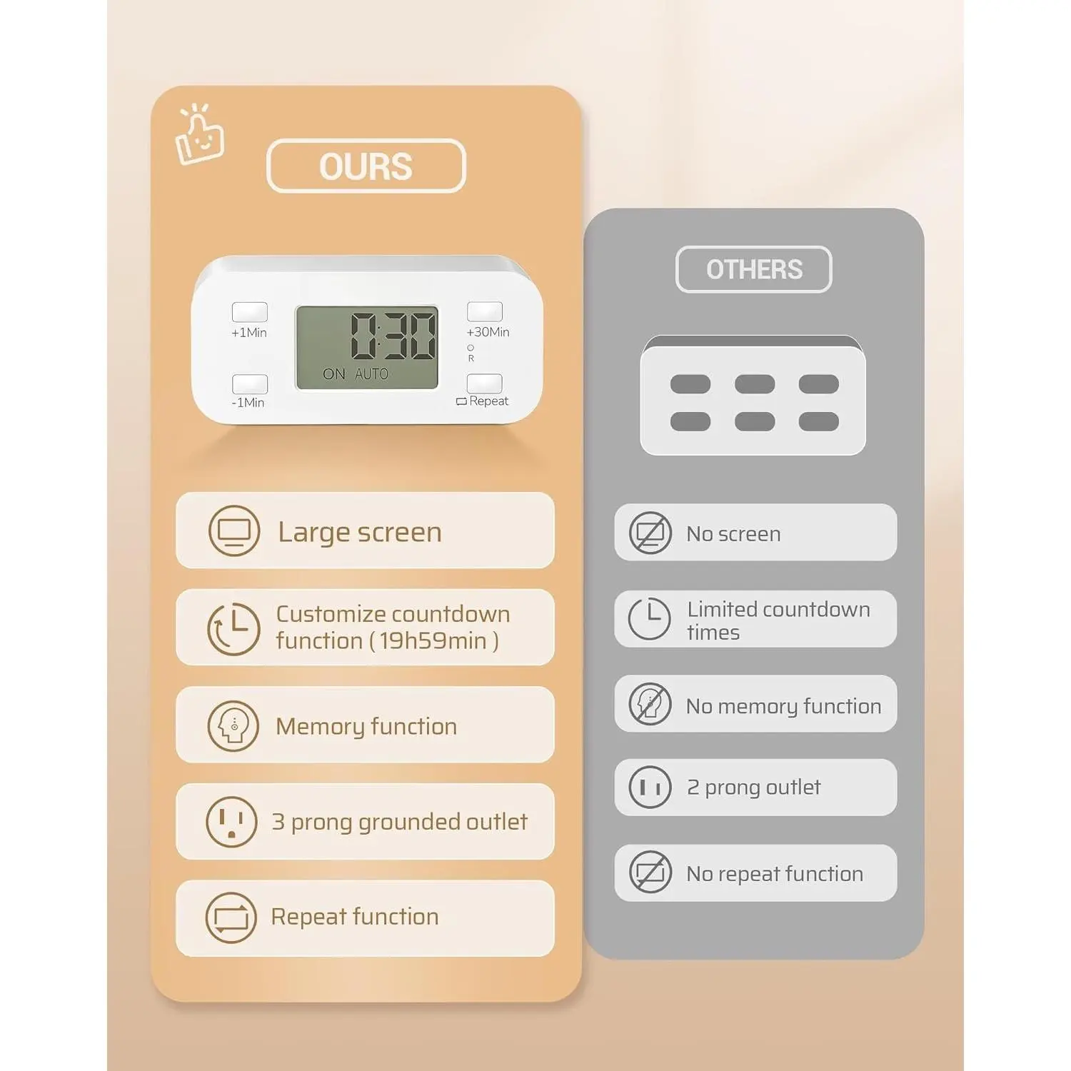 [Sophisticated, Space-Saving & Large Display] Featuring a modern and streamlined design with smooth edges and a matte finish, this device complements various decor styles; compact size avoids blocking other sockets, and the large screen shows the timer's status clearly for easy management