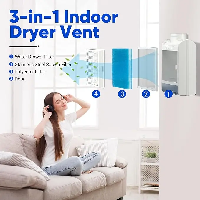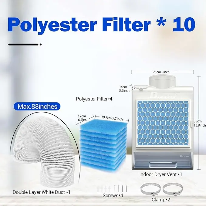 ·【3-IN-1 INDOOR DRYER VENT】Dkenicor Indoor Dryer Vent is designed with 3 layers of filtration, (1)water drawer filter,(2)stainless steel screen filter,(3)polyester filter. This 3-layer filter can effectively filter 99% of impurities. Whether it's pet hair, clothing lint or the tiniest dust. It ensures the cleanliness of indoor air to the greatest extent.