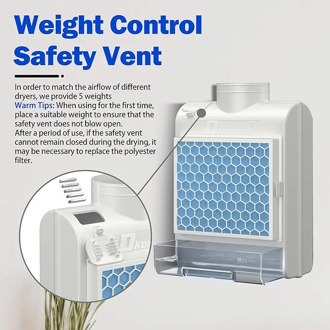 ·【PREVENT OVERHEATING VENTS】There is a safety vent flap near the duct interface. Its function is to prevent blockage of the internal filtration system and to remind the replacement of filter cotton. When using it for the first time, you can place suitable weights according to the air volume of the dryer. When it is opened during use, it reminds you that the dryer vent needs to be cleaned or the filter needs to be replaced.