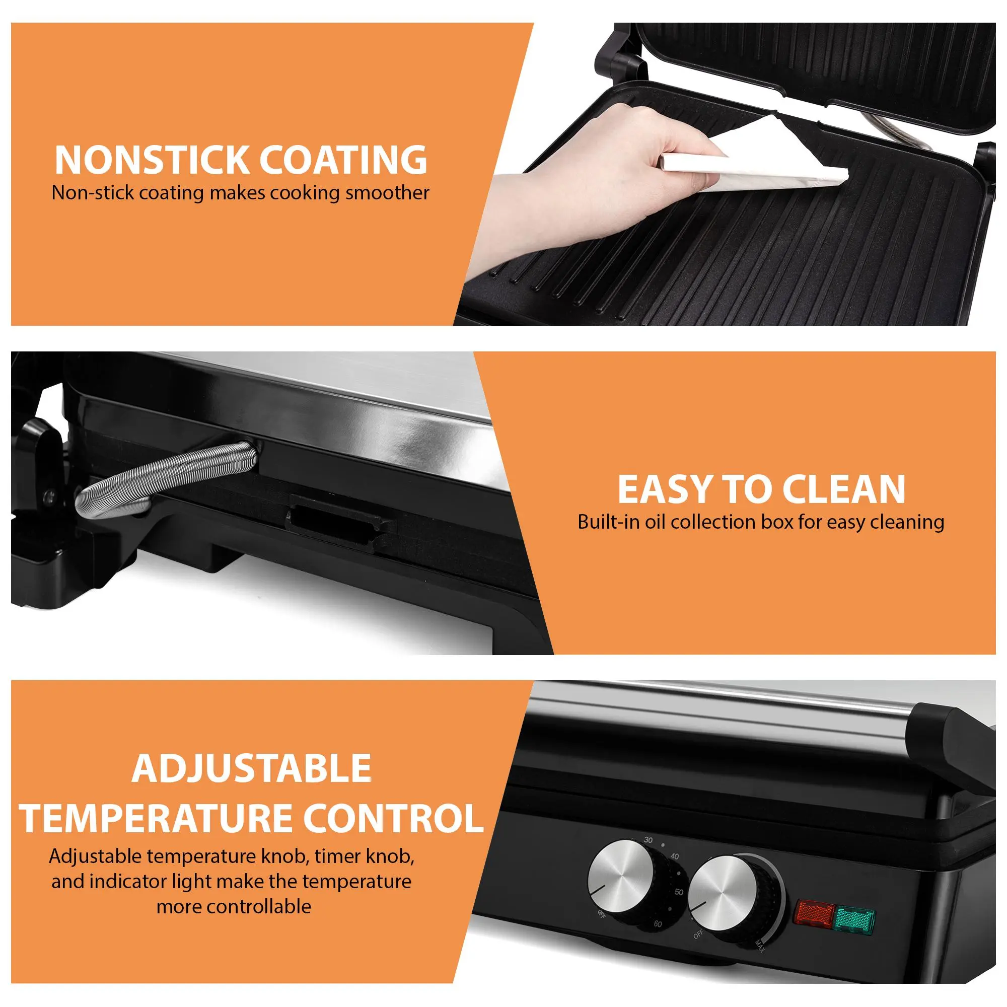 Non-stick grill plates make cleanup simple. Just wipe down with a damp cloth once cooled. A convenient drip tray gathers excess fat and liquid, keeping your cooking area clean and free from grease.