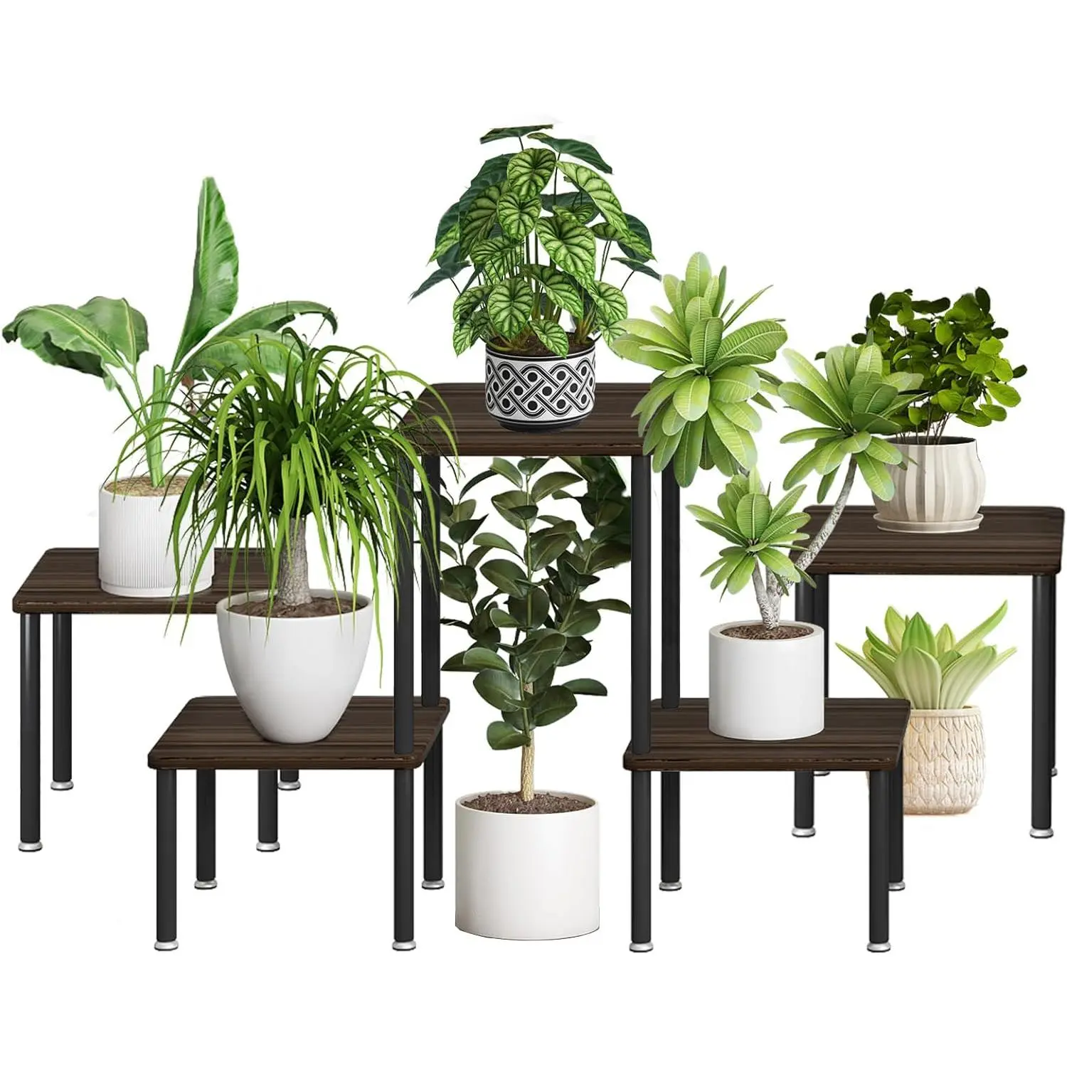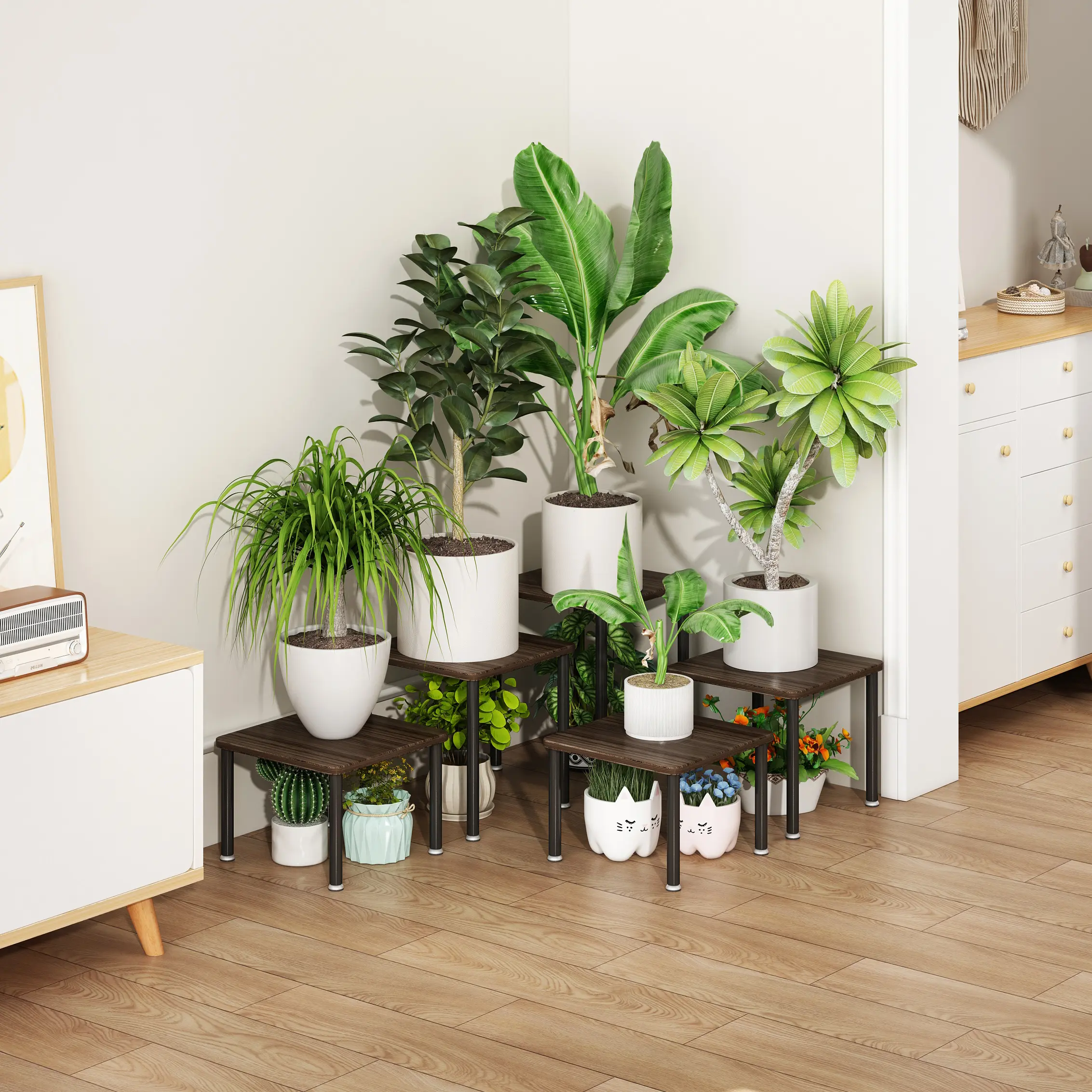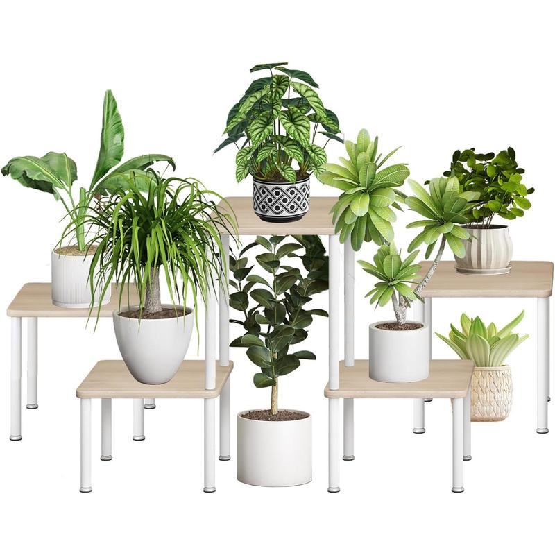 ·【Sturdy and Durable】Plant Stand is made of Durable Metal and Thicken MDF board,which has a naturally textured surface easy to clean. There are 4 adjustable feet on the bottom of the plant pots. It can ensure that the flower stand is more stable.
