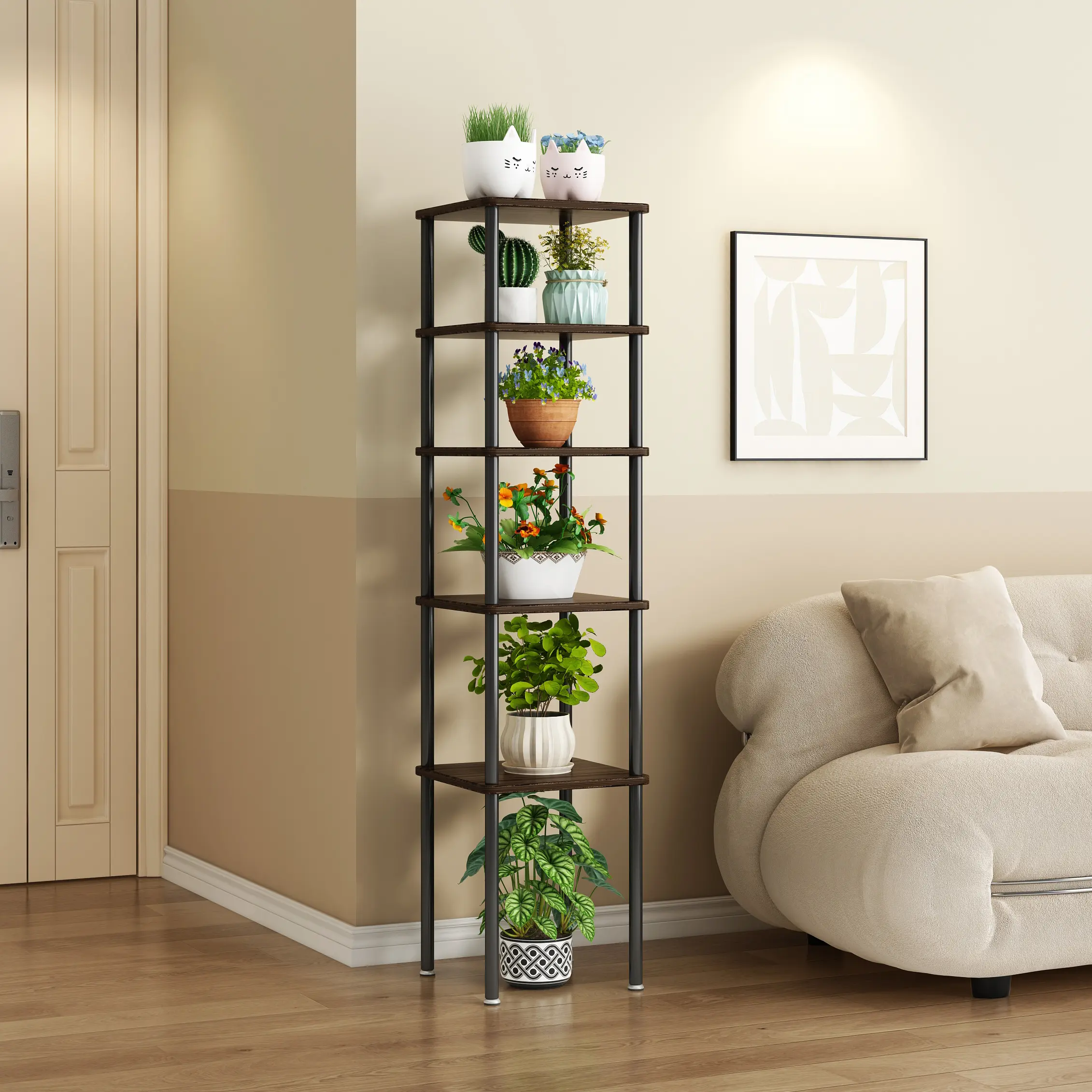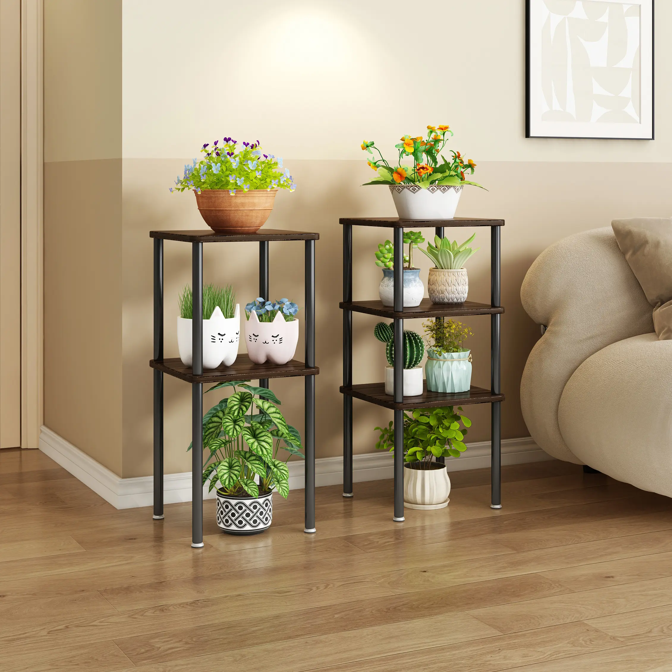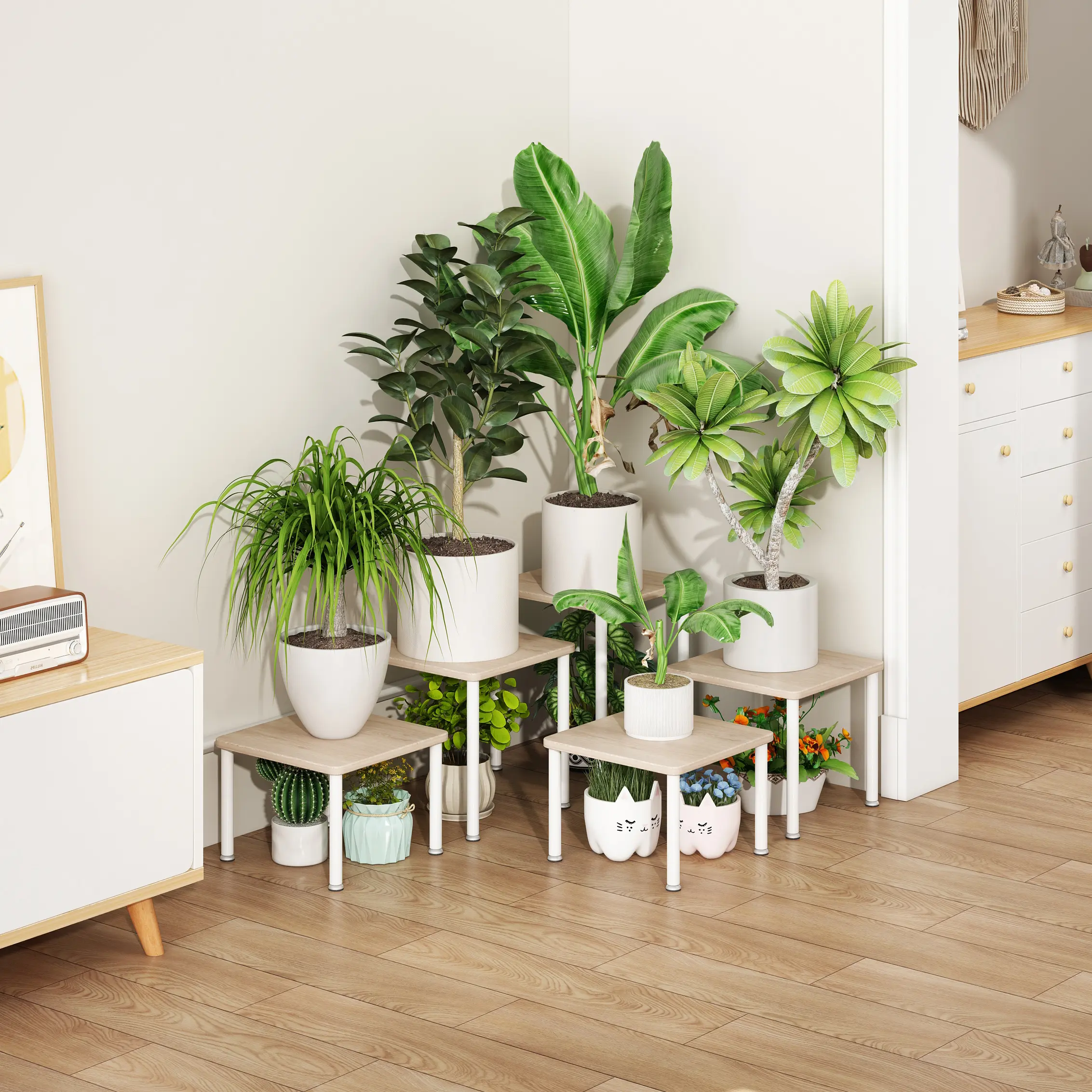 ·【Sturdy and Durable】Plant Stand is made of Durable Metal and Thicken MDF board,which has a naturally textured surface easy to clean. There are 4 adjustable feet on the bottom of the plant pots. It can ensure that the flower stand is more stable.