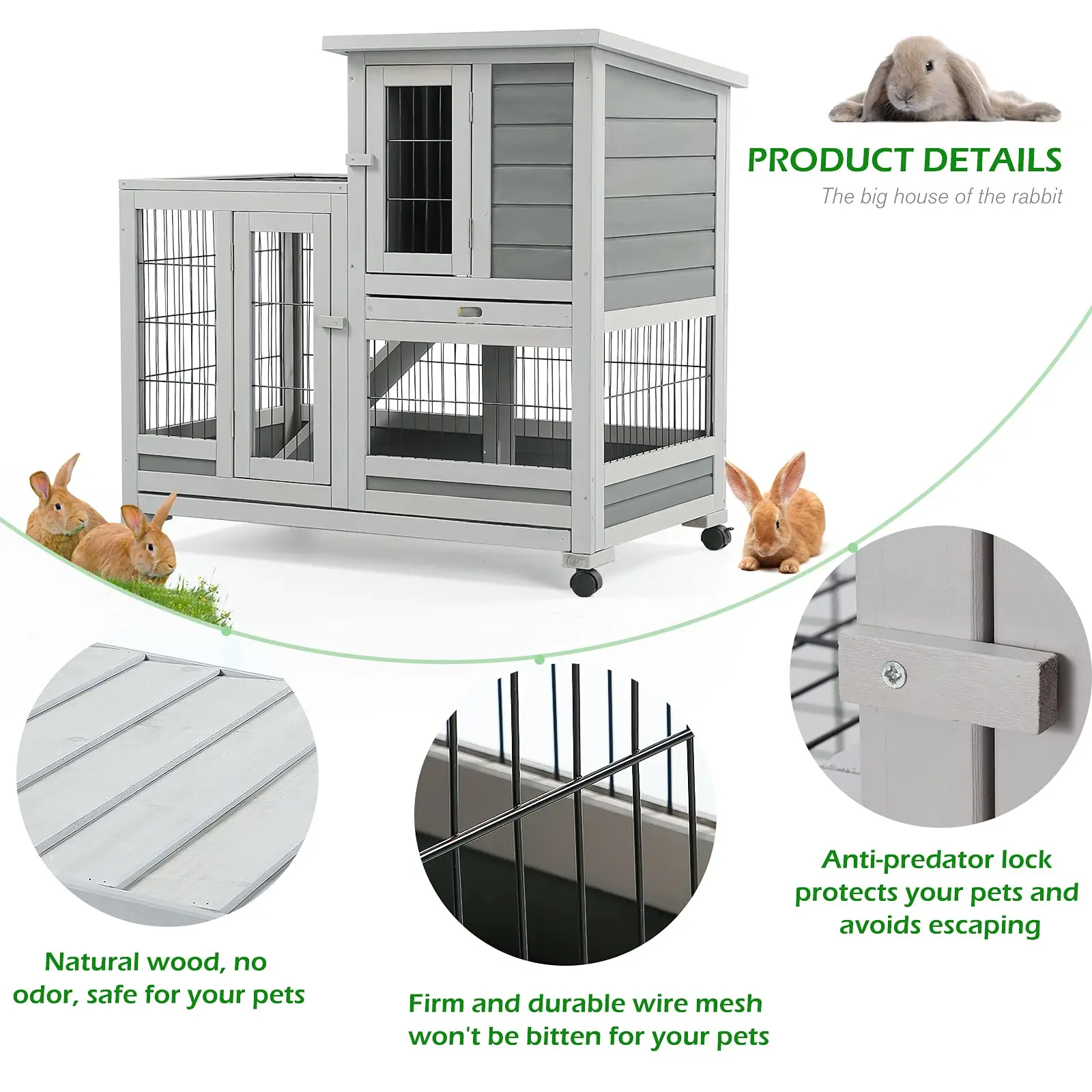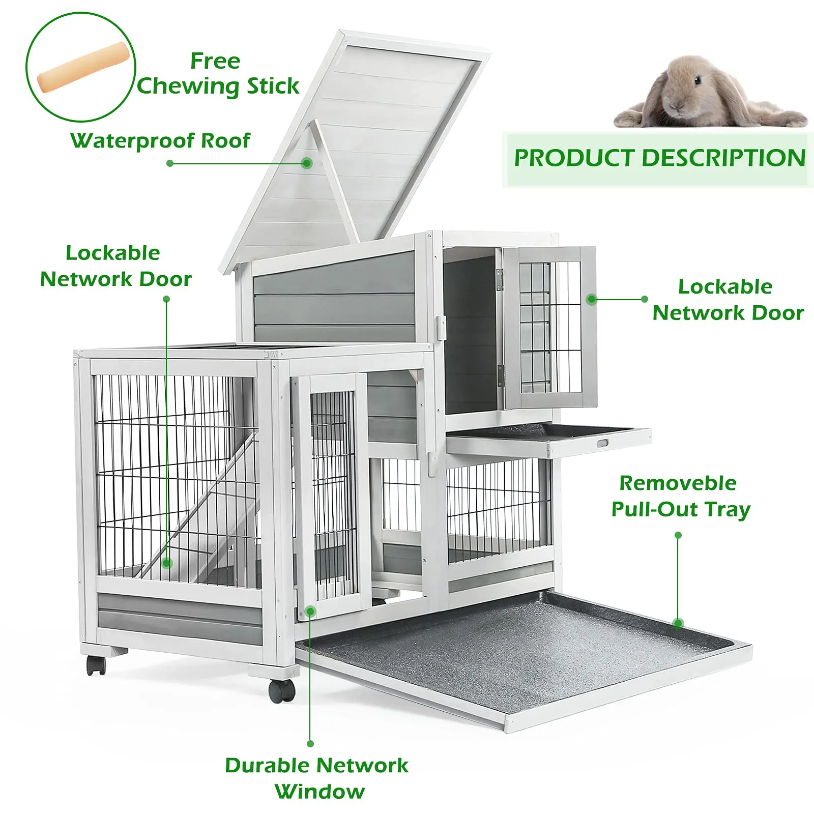 ·Multiple access: 3 access areas for easy interaction with pets and cleaning of the hutch