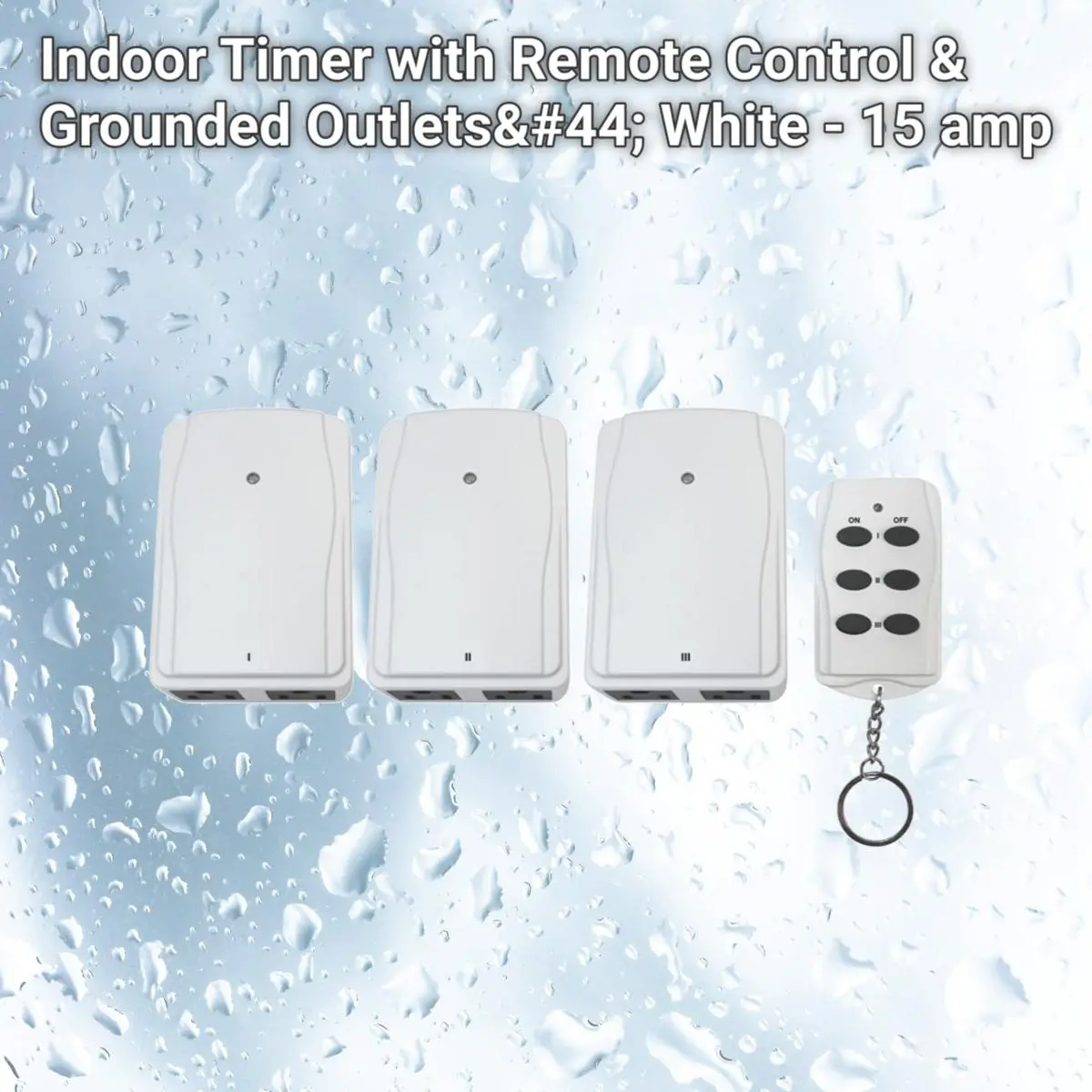 Indoor remote control timer outlet with 2 grounded outlets.One remote can operate all three outlets. Ideal for holiday decorations, hard to reach lamps, and beneficial for the mobility impaired. Features Indoor Timer with Remote Control & Grounded Outlets. Color: White. Amps: 15 amps. Grounded outlets. Indoor or Outdoor: Indoor. Programmable: Yes. Wireless remote control operates from up to 80 feet away. Two grounded outlets. One CR2032 button cell battery included.