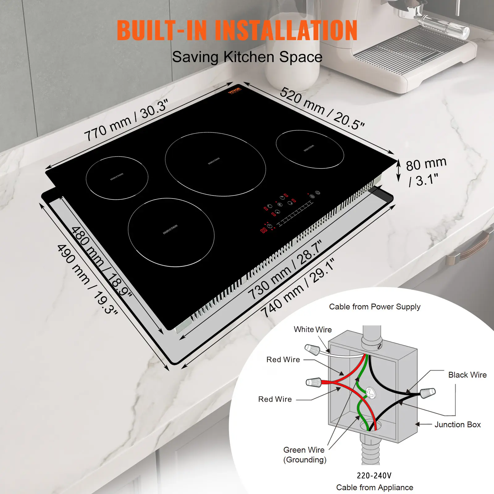 • Embedded Design: The 30-inch induction cooker is designed for built-in installation, saving kitchen space, easy to install. The round edges with no sharp corners design is stylish and secure. It is suitable for voltage ranging from 220-240V, 50/60Hz.
