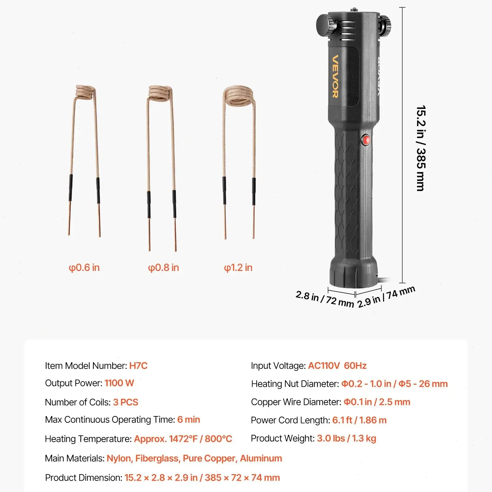 ·Quick Disassembly: High-frequency electromagnetic field heating with 1100W of power allows the metal to quickly expand within 30 seconds, making it easy to remove. The induction heater produces no flames, requires no water cooling