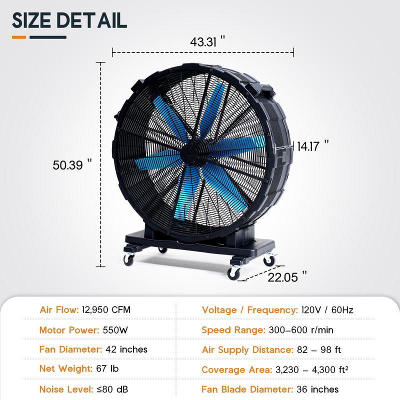 ·Powerful Motor: Featuring a full copper, sealed motor, this 42in industrial drum fan delivers dustproof and moisture-resistant performance with 3 adjustable speeds and a maximum airflow of 12,950 CFM, a 48in fan maximum airflow of 17,660 CFM
