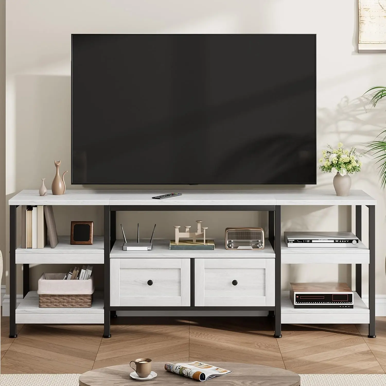 2 Drawers + Multi-Layer Open Storage: Maximize organization with this versatile entertainment center. It combines 2 fabric-lined drawers for concealing clutter with 4 open shelves for displaying decor, books, or media equipment, offering a perfect balance of hidden and open storage