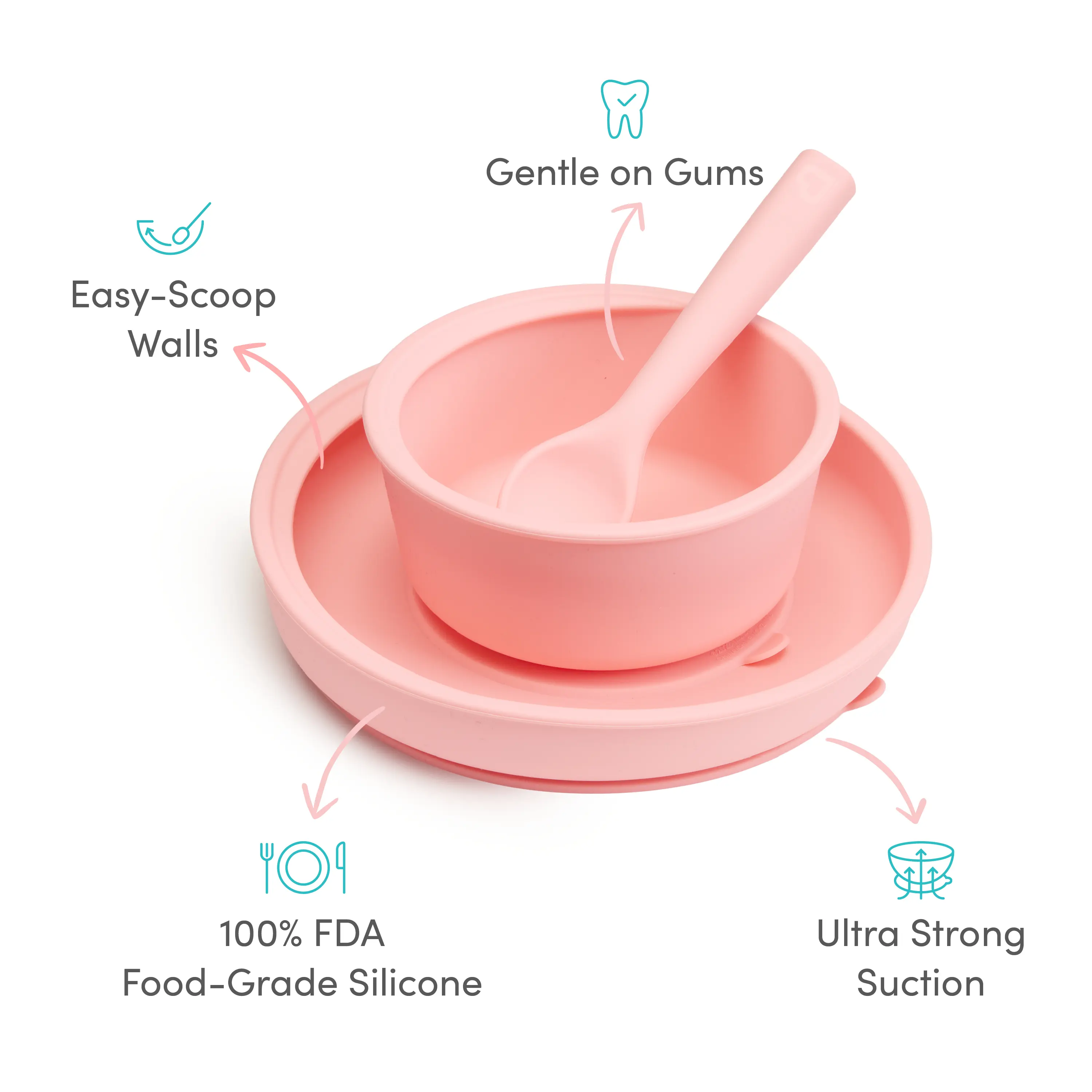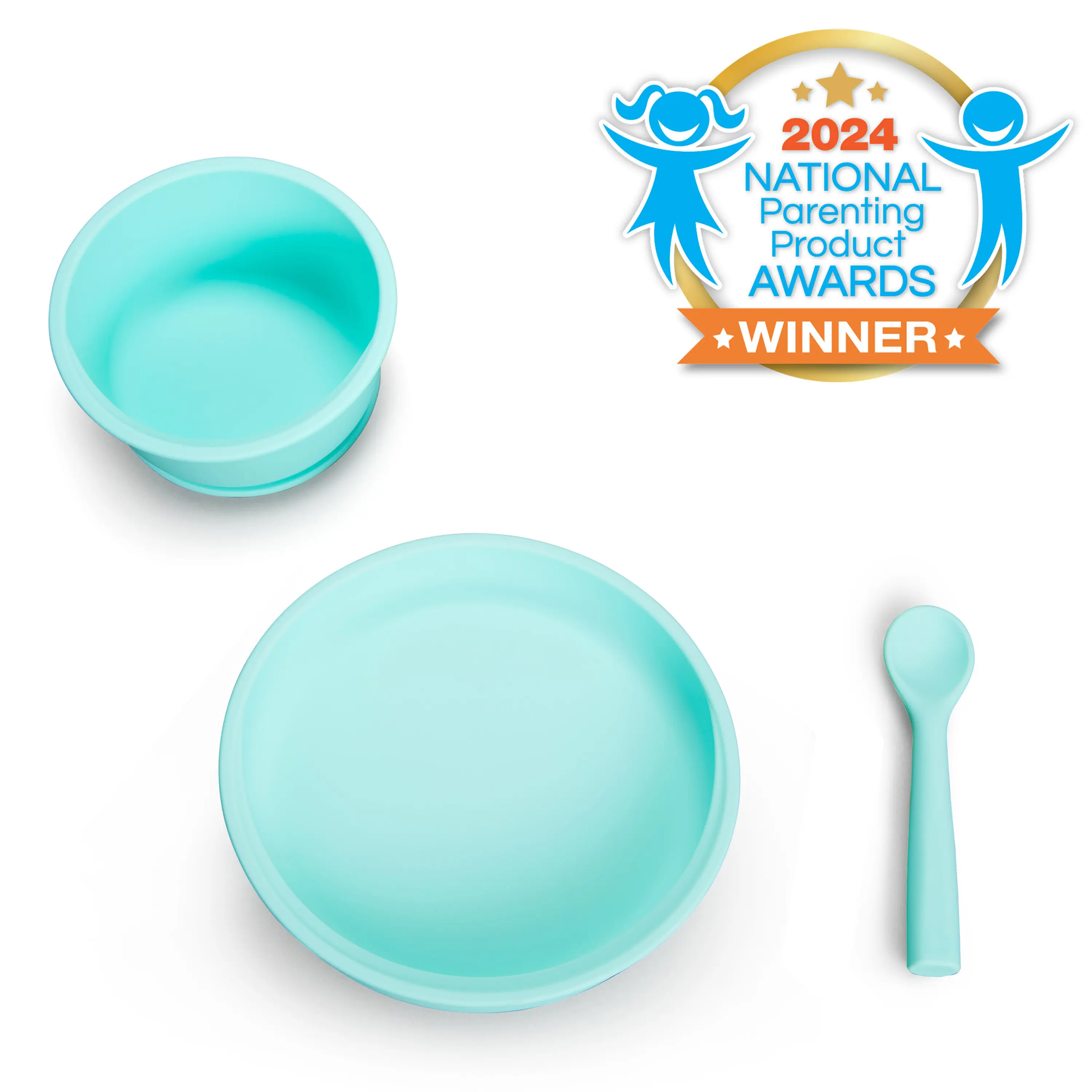 ·Starter mealtime set includes one suction plate, one suction bowl, and one easy-grip spoon