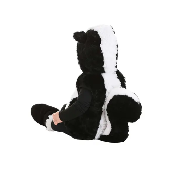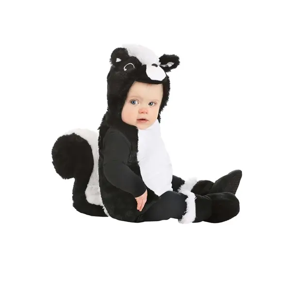 Stinker SerendipityWhen you chose the rather sophisticated palette of black and white for your baby's room, you knew it would need a playful twist. You didn't know choosing skunks over zebras or pandas would be an oddly defining decision. But your squirmy cutie turns out to be as playful, mischievous, and alarmingly smelly as those adorable woodland stinkers! Now, it only makes sense to carry the theme into your baby's first Halloween with our exclusive Infant Silly Skunk Costume!Design & DetailsThis Made By Us infant costume transforms your little stinker into an adorable baby skunk toot-sweet with just three pieces. The ensemble starts with a thoughtfully constructed bodysuit made from soft faux fur and cuddly fiberfill stuffing. Getting Baby in and out of costume is made simple with hook-and-loop fastener strips installed at the front left shoulder. Meanwhile, snaps along the inseam ensure easy diaper access. The attached hood covers Baby's head and provides the ensemble with some of its defining skunk features like a tiny nose and ears. The full and fluffy soft-sculpted tail attaches to the back of the suit with hook & loop fastener to keep Baby comfortable or provide a snuggly toy. Lastly, a pair of booties give Baby essential and furry skunk feet!Silly Skunk Costume ComfortsGet your sweet stinker looking the part with this too-cute Silly Skunk Costume exclusive! Modeled after a skunk's signature black and white coat, even your tiny tots will be able to see how good they look as the forest critter. Plus, with a cozy yet spacious design perfect for layering, you'll rest easy walking into your kiddos' first trick-or-treat, knowing they're dressed for the fall weather!