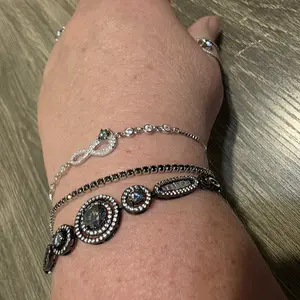 Absolutely stunning infinity bracelet and nec with a smokey gray stone on both.