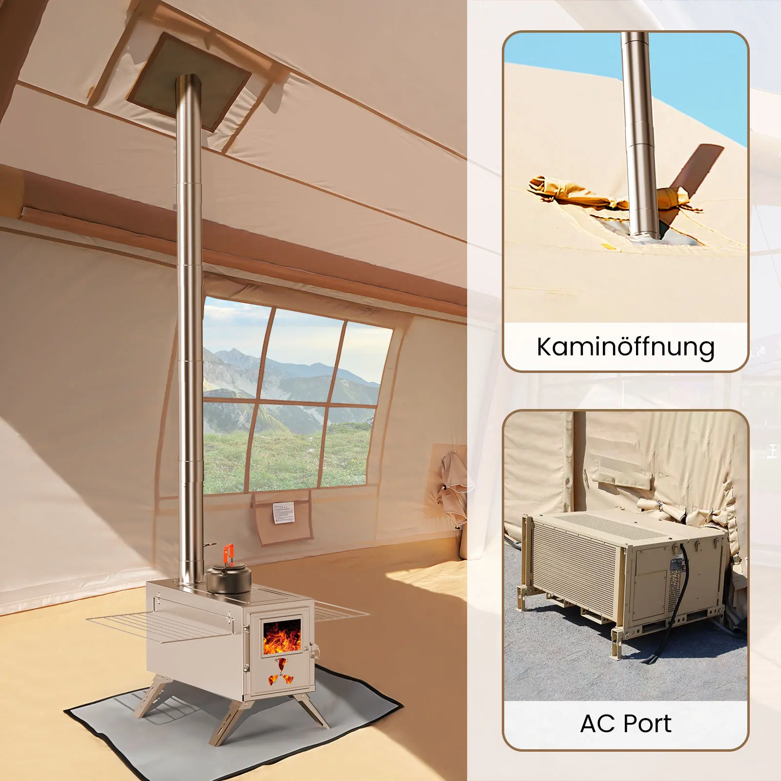 Built-in Stove Jack for All-Season Comfort: Integrated chimney port allows safe indoor use of wood-burning stoves, enabling warm meals and cozy heating without leaving your tent. Gathering around a crackling wood-burning stove fosters a snug and inviting ambiance, particularly during chilly weather, enhancing the camping experience with added joy.