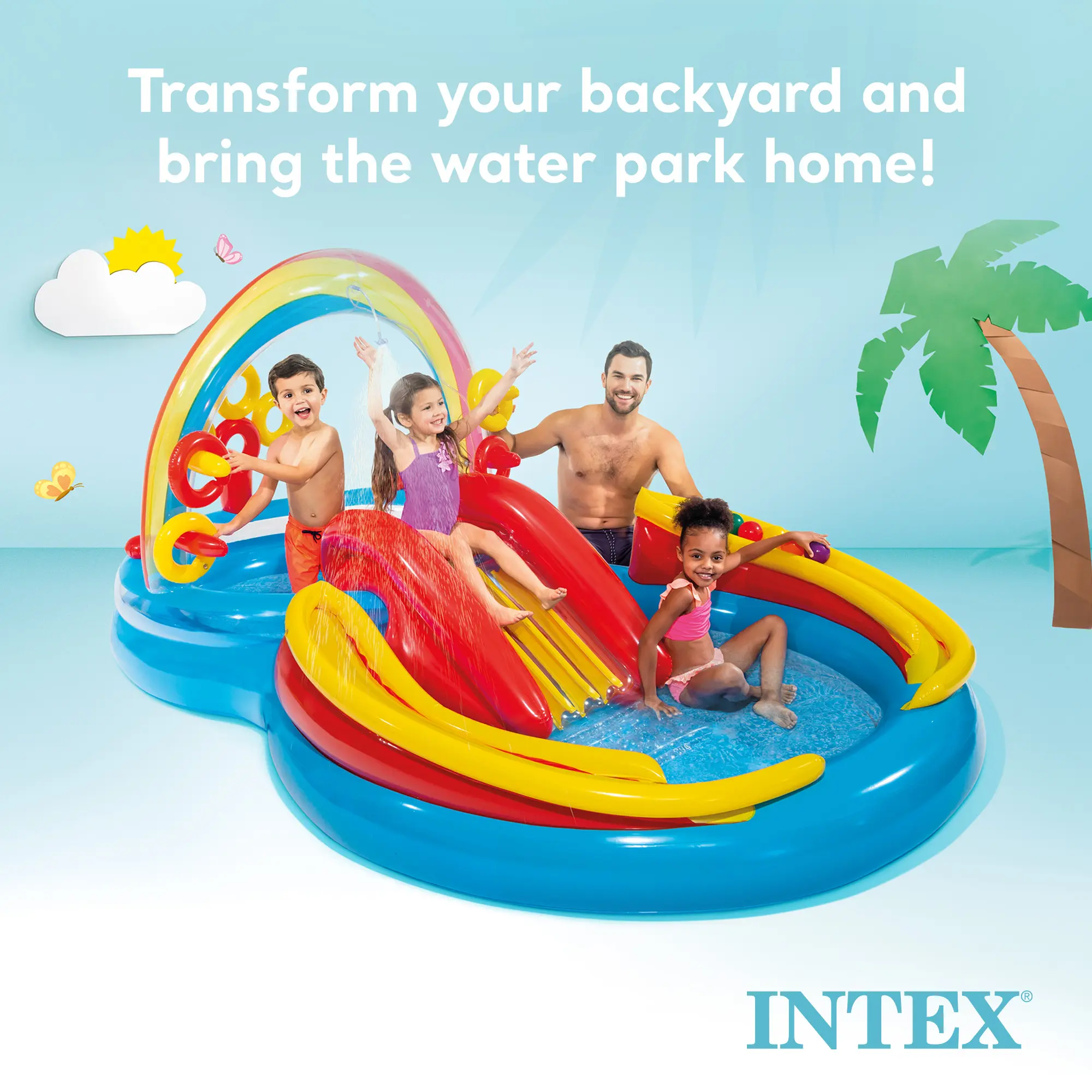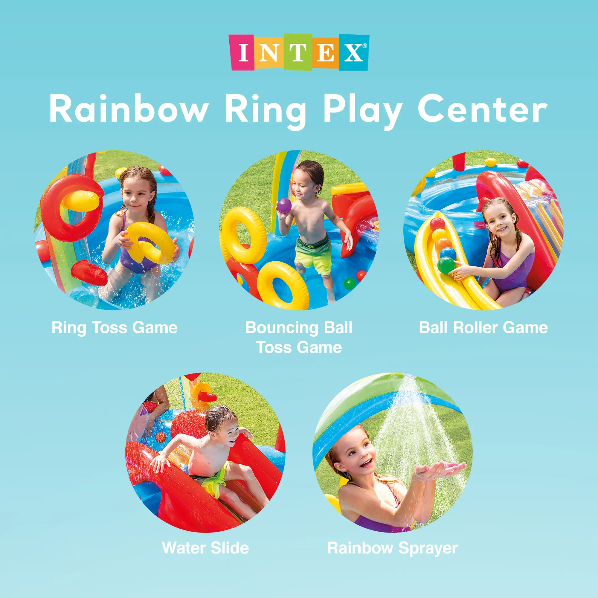 Make summer unforgettable with the Intex Inflatable Kiddie Play Center Collection the ultimate backyard water park for toddlers and kids ages 2+. Each inflatable play center features a kids water slide, splash pool, built-in sprayer, and fun interactive games, easily connecting to a standard garden hose for instant outdoor fun. PUMP NOT INCLUDED