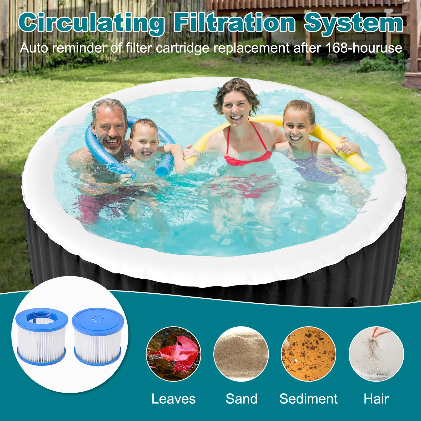 【SUPERIOR FILTRATION】 - Equipped with an advanced filtration system, the blow-up hot tub ensures consistently clean water. Two easily replaceable filter cartridges efficiently capture sand, debris, and hair. A handy reminder from the heater pump prompts filter replacement after 168 hours of use. When the filter loses its filtering function, the control panel will automatically alarm and display FC