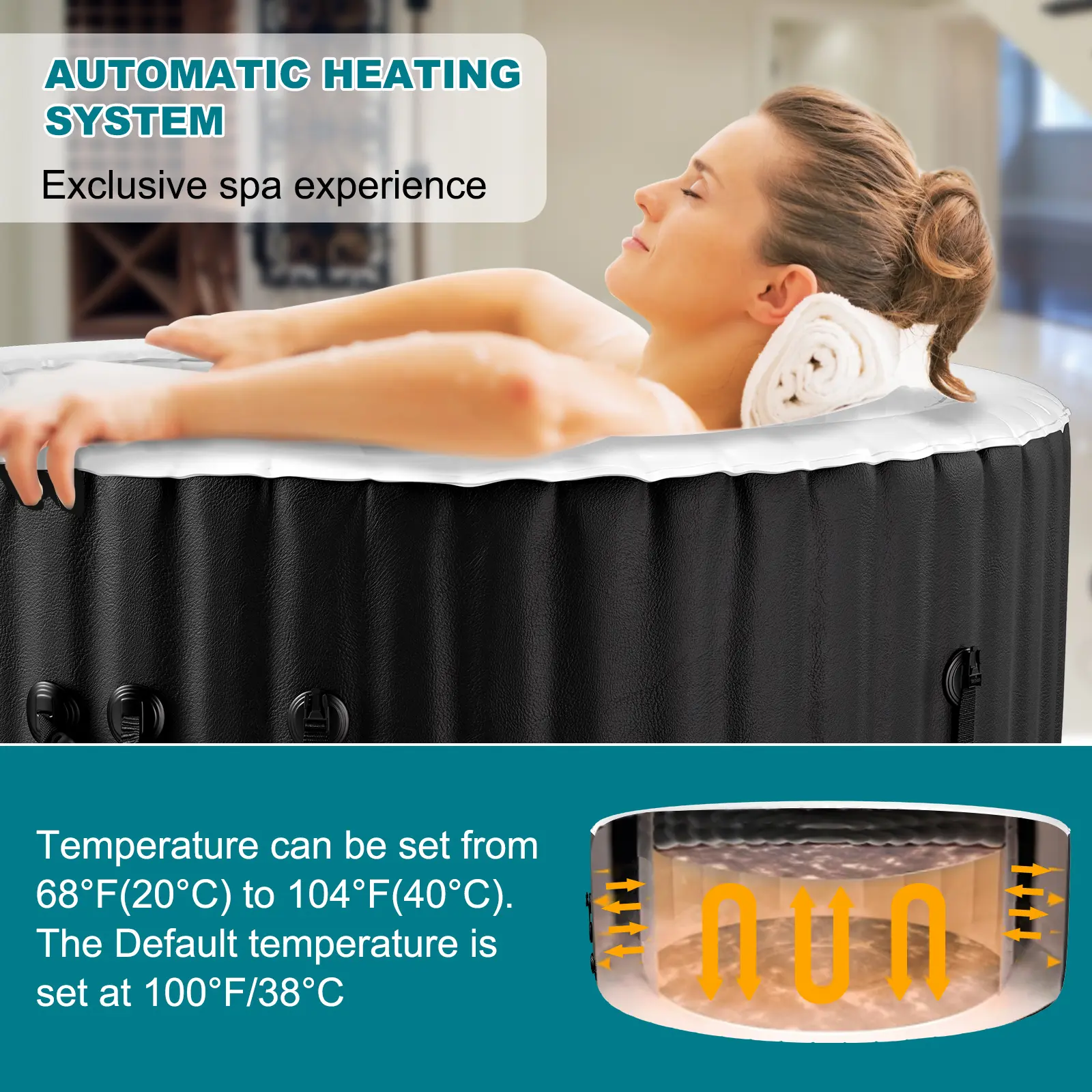 【EFFICIENT HEATING SYSTEM】 - Featuring a PTC heating design, the hot tub's heater pump delivers a robust 1350W of heating power, raising the water temperature by 1.8-2.7℉ per hour. The SPA cover enhances heating efficiency, and once the desired temperature is reached, the thermostatic system kicks in for optimal energy management.