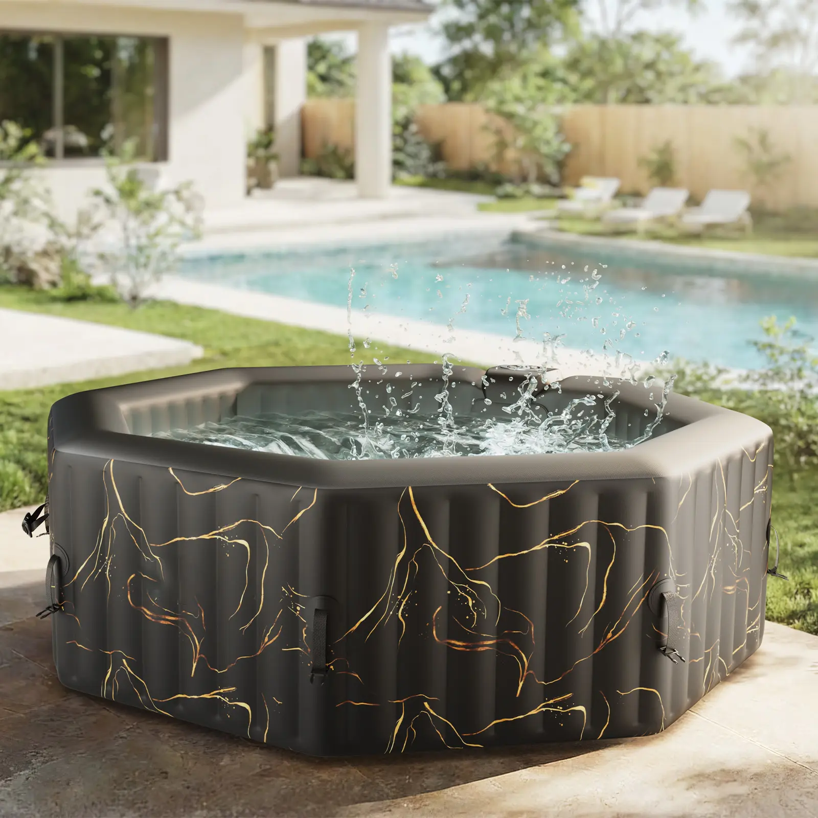 4-6 Person Octagonal Inflatable Hot Tub: RELXTIME luxury spa tub with bubble jets and integrated water filtration system in an elegant black and gold design, ideal for outdoor relaxation.