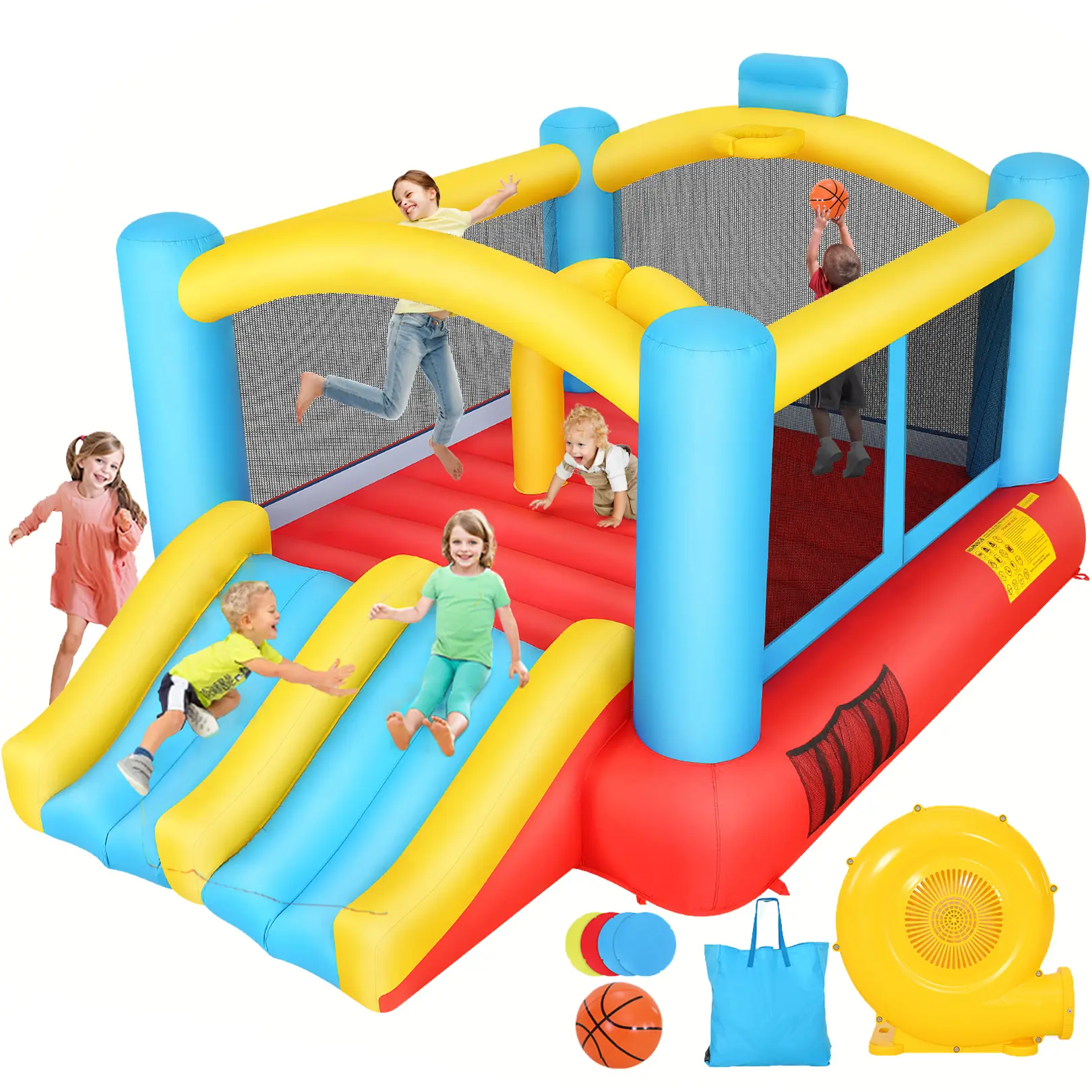 1 x inflatable bounce house,6 × plastic stakes, 4 × blower stakes,14 × repair patche, 1 × AC 110V 370W blower,1 × Instruction Manual,4 × hook-loop fasen, 4 × Suture line,1 × carry bag