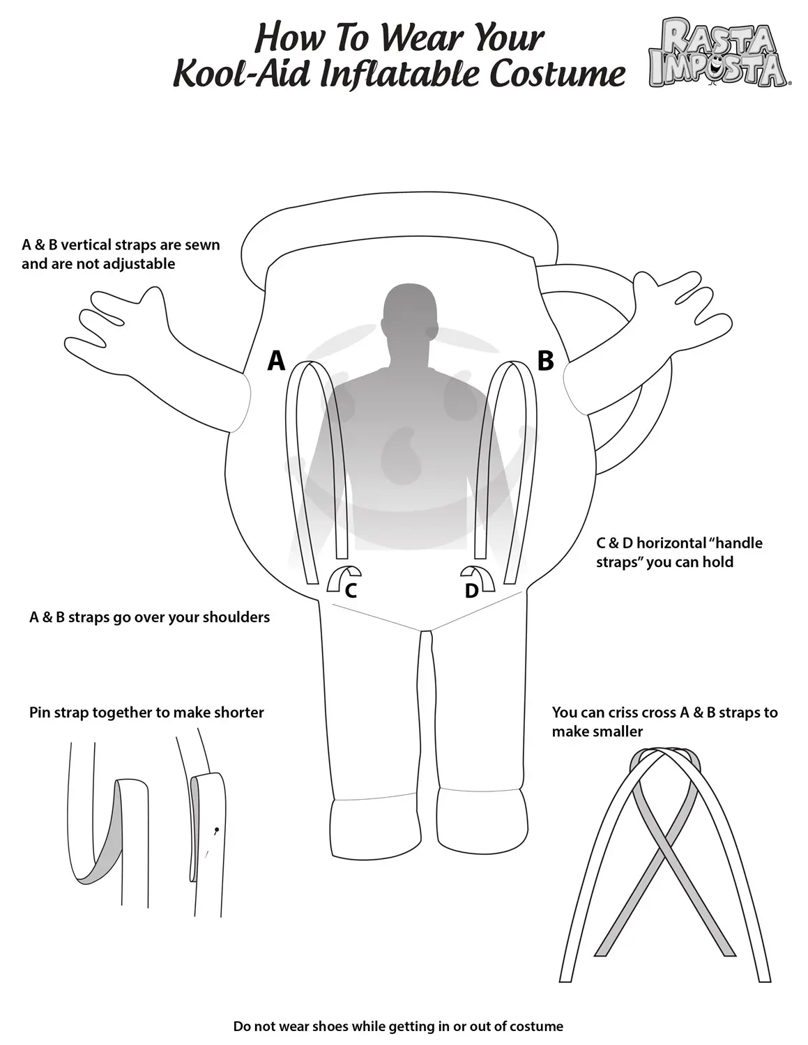 OH YEAH! Kool-Aid Man is back and better than ever. Wear your very own Kool Aid Man Inflatable Halloween Costume! Click here to see Kool-Aid Man on Twitter!!! Click here to see a video of this over-sized fun costume in action! Includes a full body over-sized inflatable costume with a battery operated blower. It is printed on the front only in the likeness of the actual product, includes adjustable shoulder strap suspenders for the costume to rest on, a back zipper for easy wear ability and is equipped with various screens as eyes, nose, and mouth areas which have been created for easy visibility; this has been created to accommodate various heights. The arm holes are open, but it depends on the length of your arms and if they would reach to both sides. Also, the hands cannot be exposed at the end of the arms. Costume's non-airtight sewing seams and zipper allow for constant inside air circulation and ventilation. Requires 4 AA Batteries (not included). BATTERIES ARE NOT INCLUDED. One size fits most adults. Expertly designed for you with precision and care by the Rasta Imposta team in Runnemede, NJ, USA. Easy wear & care! 85% Polyester/10% Plastic/5% Metal. Hand wash inside out. Air dry. Do Not Iron. Kool-Aid is owned by Kraft Foods and are used under license. All rights reserved.
