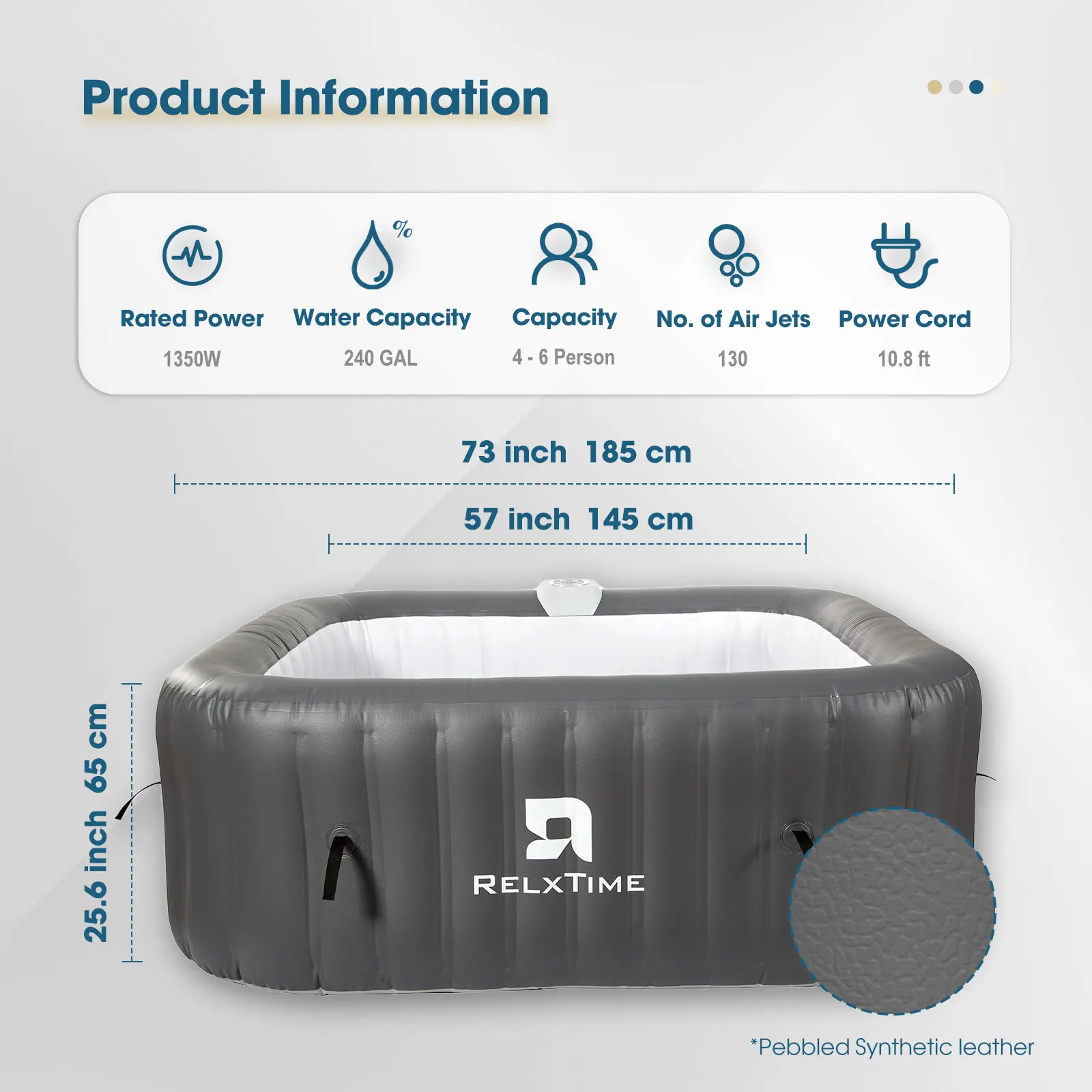 ·Spacious size of 73"L x 73"W x 25.6"H, perfect for 4-6 adults to enjoy a relaxing spa experience