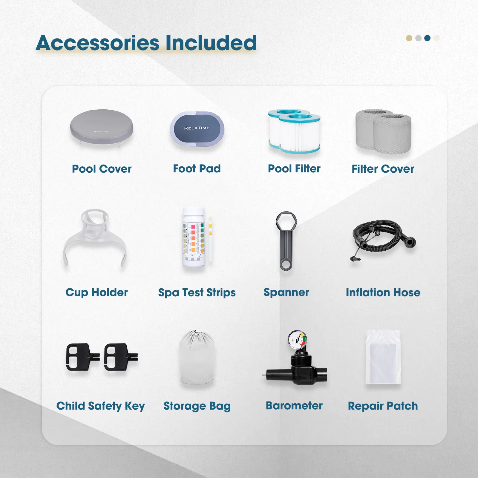 ·Comes with a pool cover, 4 fixed seat cushions, 2 filter cartridges, and various accessories for a complete setup