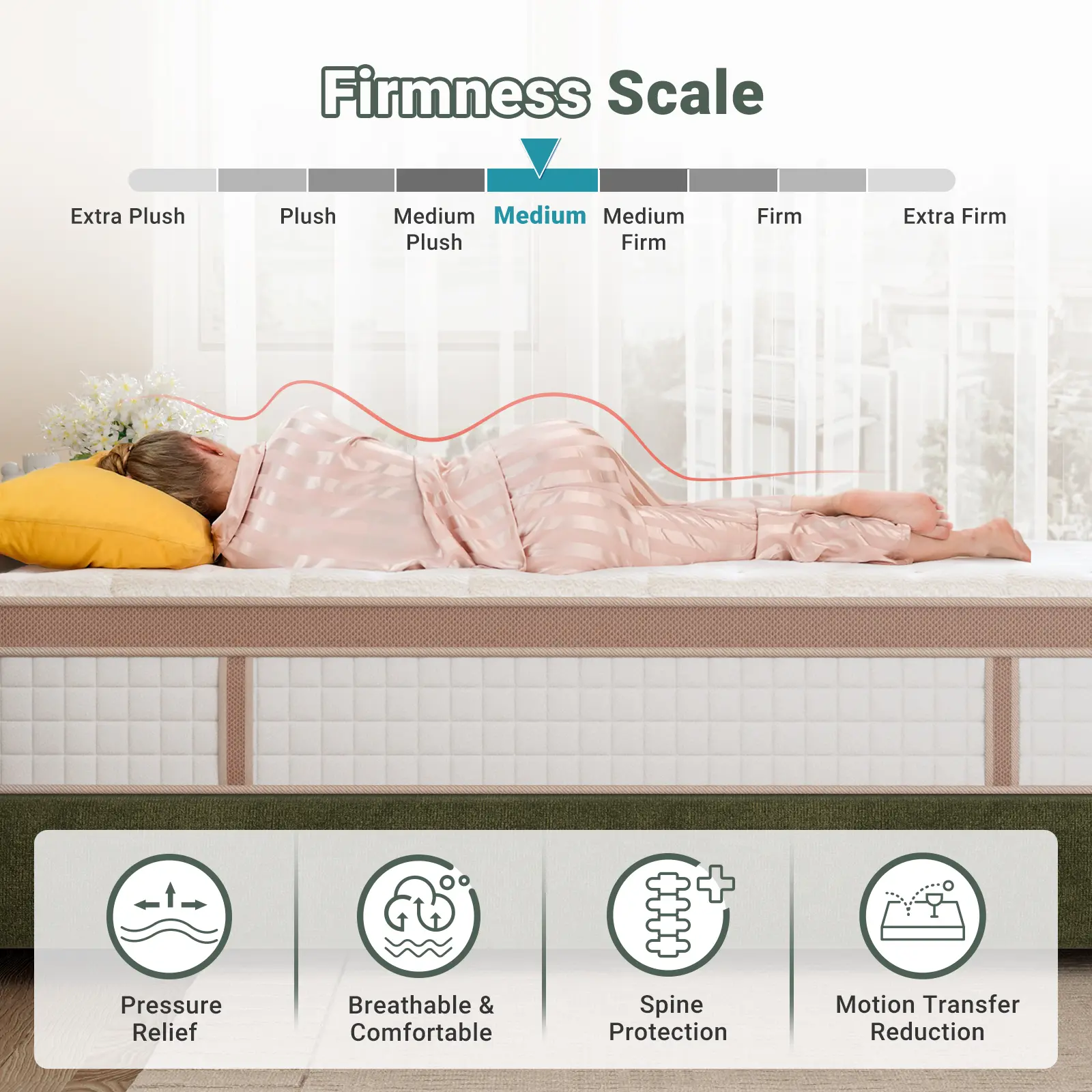·[ Silent Sleep, Motion Isolated ]: Our firm hybrid mattress is crafted with individual pocket springs, minimizing noise and motion transfer for a serene sleep experience. Perfect for those who share a bed, ensuring you stay undisturbed throughout the night.