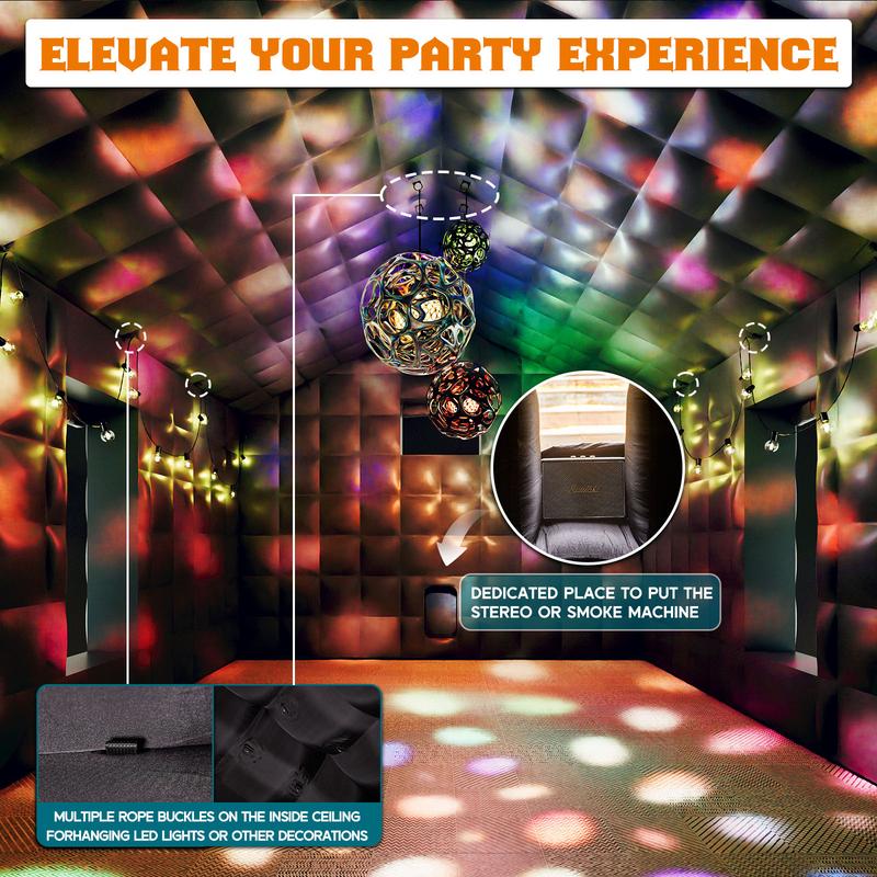 Elevate Your Party Experience: Multiple rope buckles on the inside ceiling for hanging LED lights or other decorations, dedicated place to put the stereo, enhance your party atmosphere with this inflatable club tent