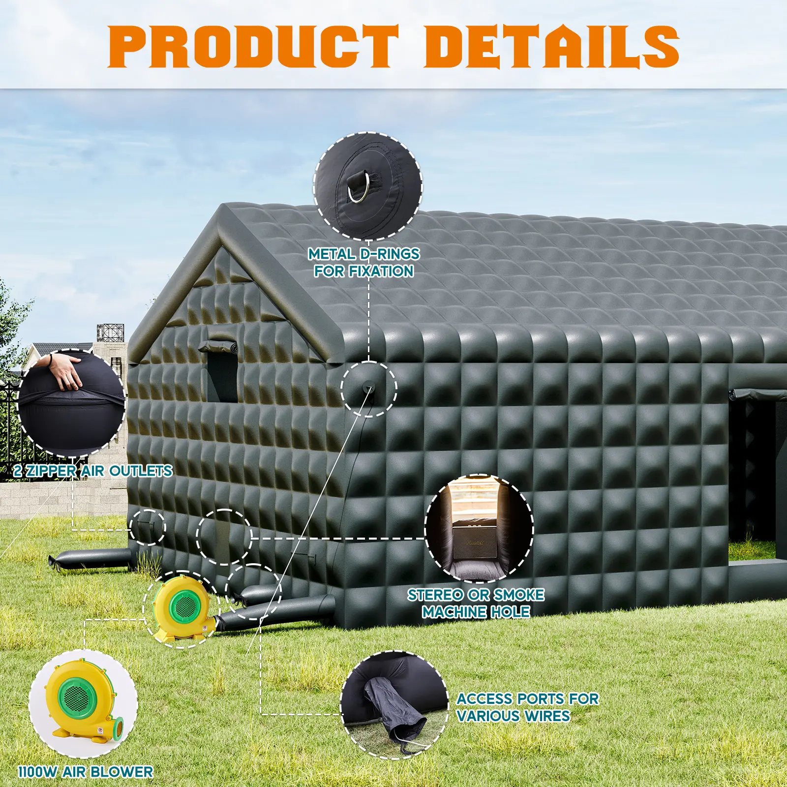 ·Easy to Install and Storage: Equiped with 1100W blower, 4 zipper air outlets, just need 3-5 minutes to set up and easily deflated. And you will get D-rings, ropes, ground nails, repair cloth and sandbags to enhance the stability of the inflatable party tent