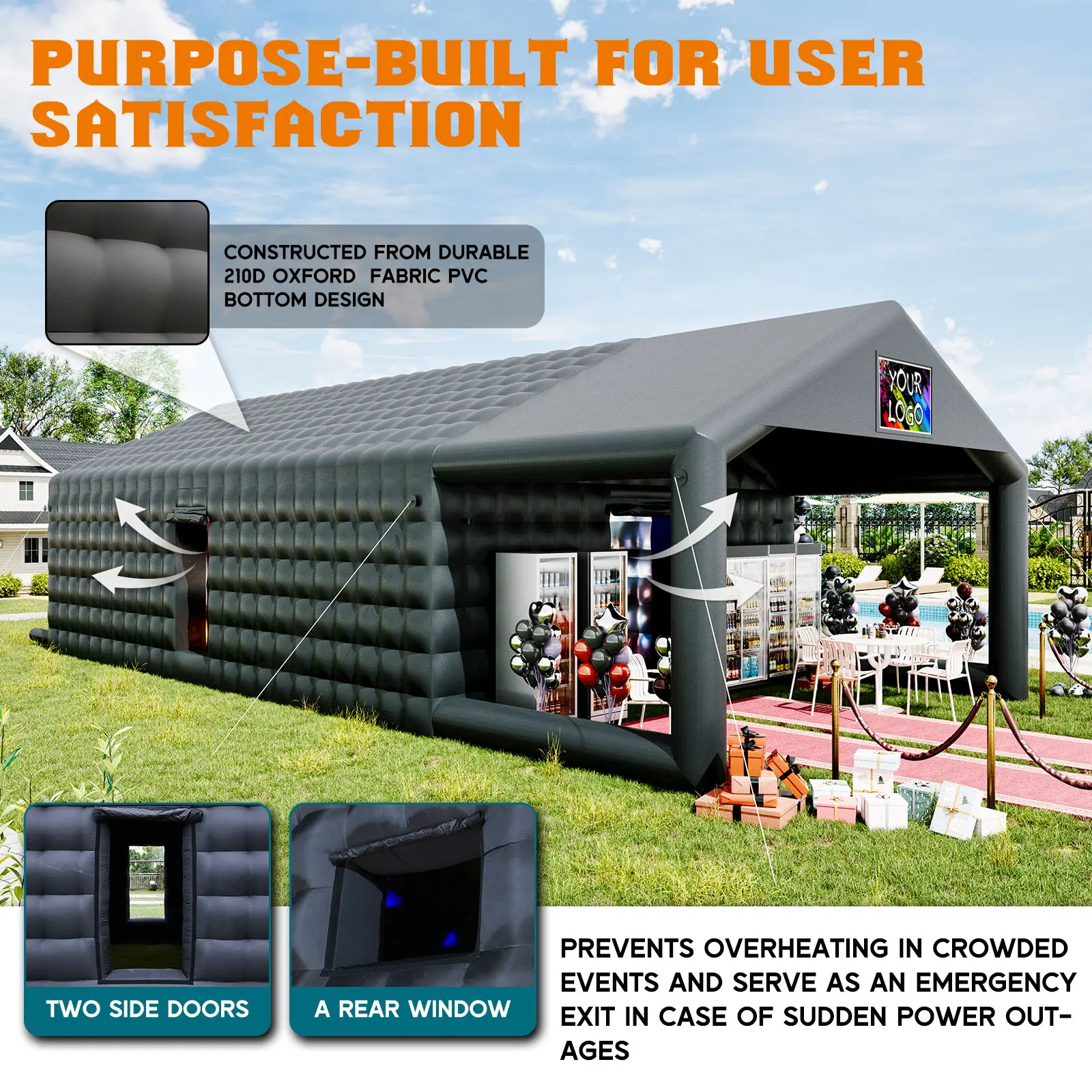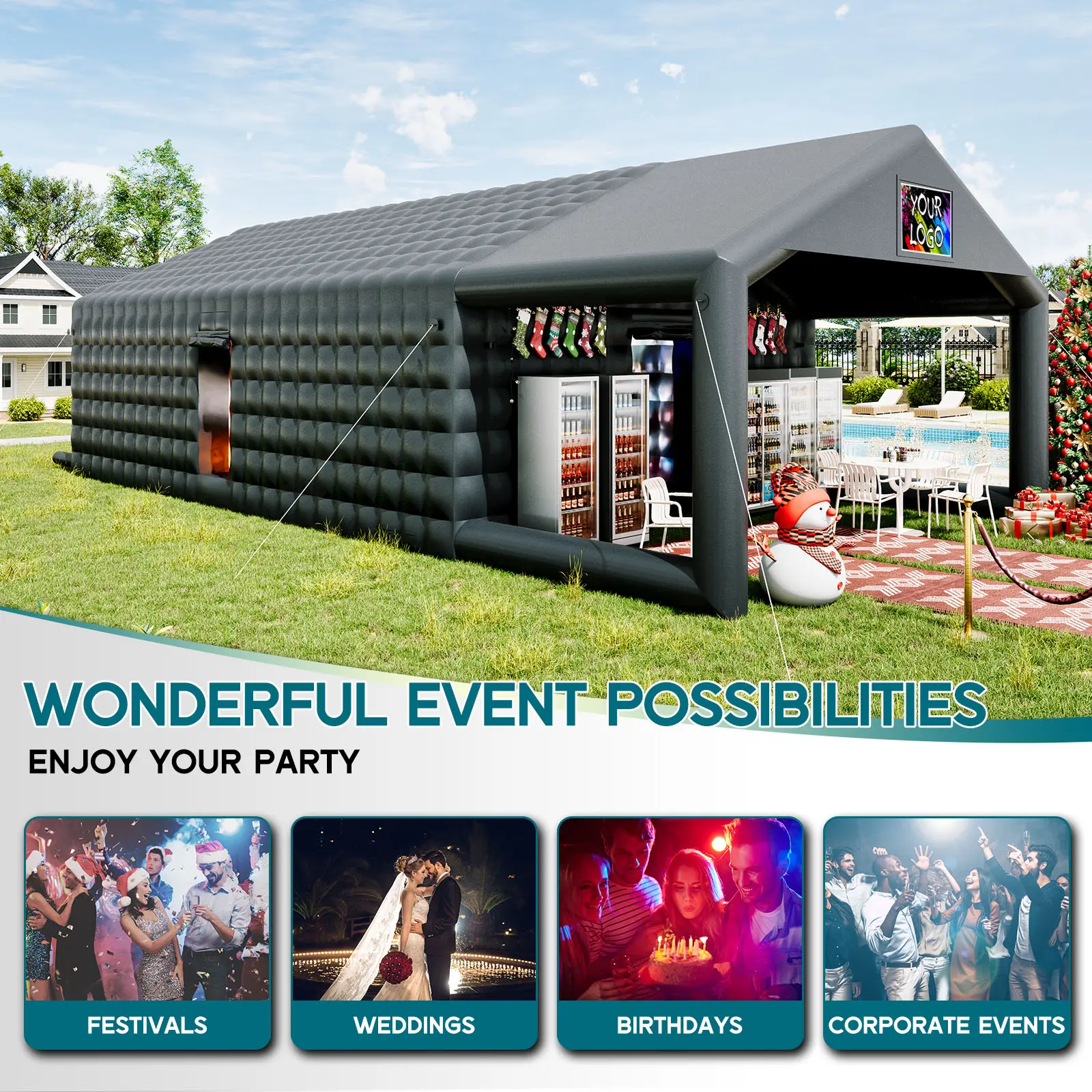 ·Wonderful Event Possibilities: Our inflatable night club is tailor-made for a myriad of events-weddings, birthdays, graduations, anniversaries, festivals, or corporate events, you can DIY your event's unique logo above the entrance