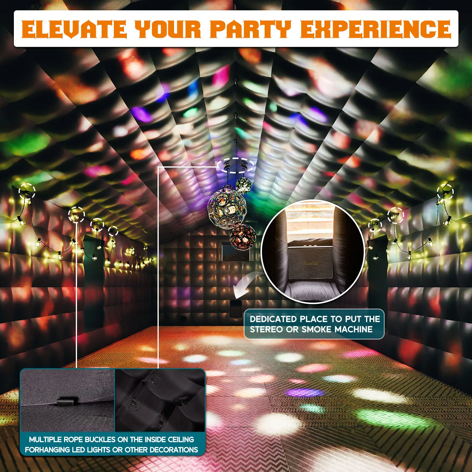 ·Elevate Your Party Experience: Multiple rope buckles on the inside ceiling for hanging LED lights or other decorations, dedicated place to put the stereo, enhance your party atmosphere with this inflatable club tent