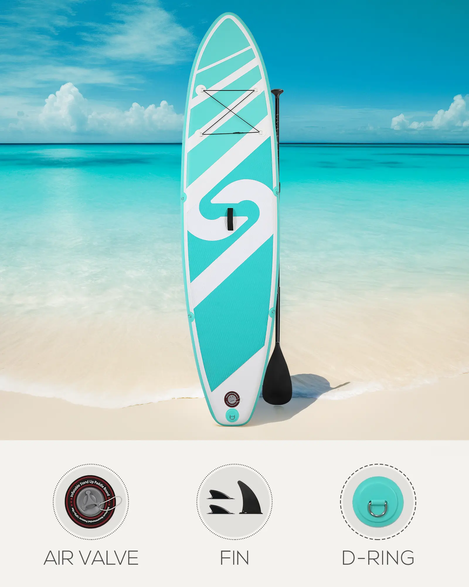 ·【Safety Leash & D Ring & Anti Scratch】The inflatable paddle board comes with 1 main fin and 2 small fins to ensure stability and balance. And high-quality PVC materials protect the paddle board not to be scratched by sharp points. This SUP is equipped with elastic safety leash. One side is connected to the paddle safety ring and the other side is connected to the ankle to ensure your safety. Inflatable paddle board with stainless steel D-ring, which can be connected to the seat.