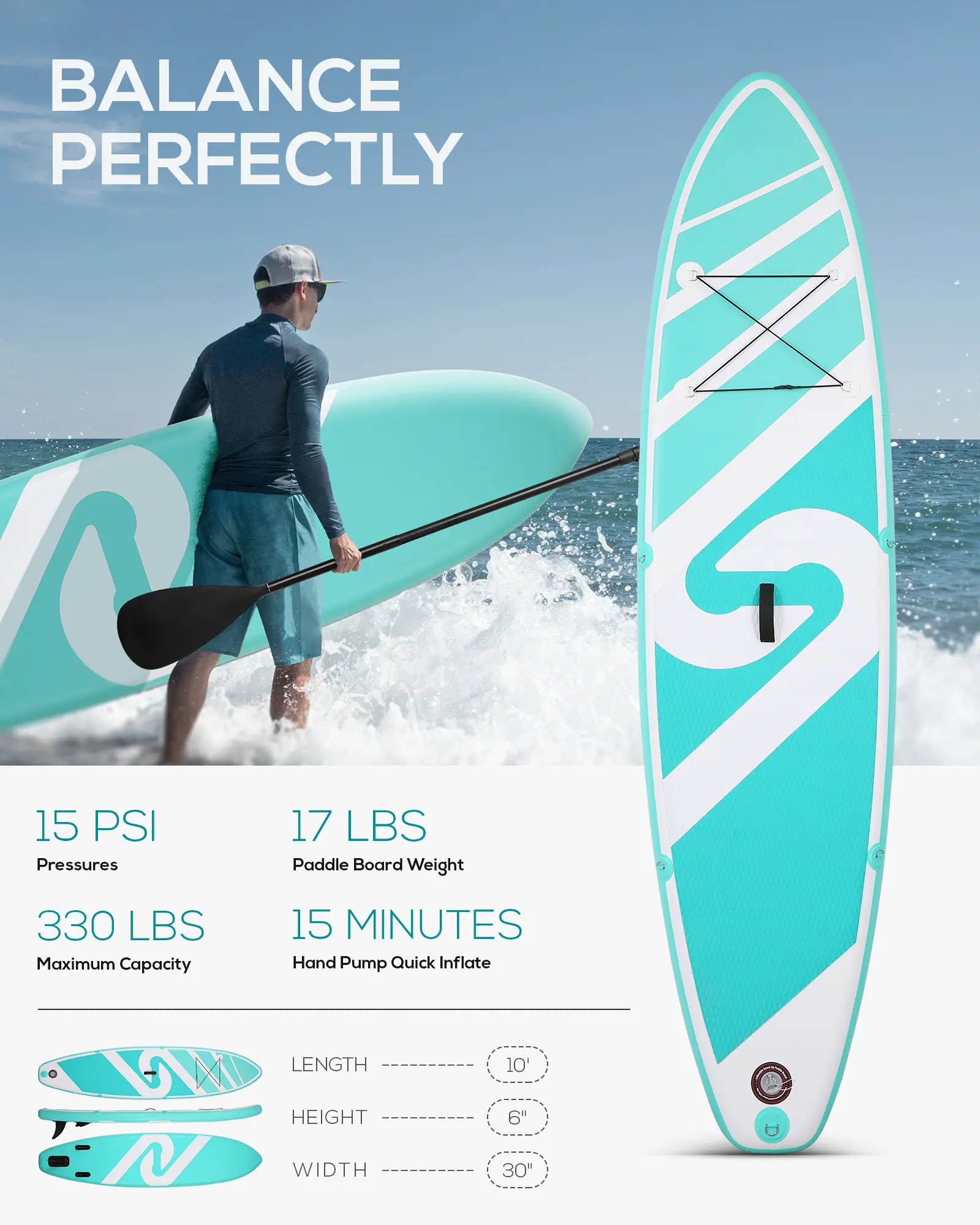·【Extra Wide Design & Lightweight】The extra wide design(Width:30") makes this inflatable paddle board suits for surfers of all levels in various waters, such as in ocean, lake and rivers. This paddle board sizes 120"(10')x30"x6", which only weights 17LBS for travelling and its weight capacity is 370LBS.