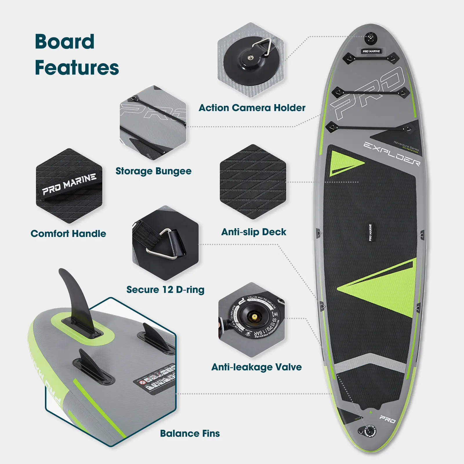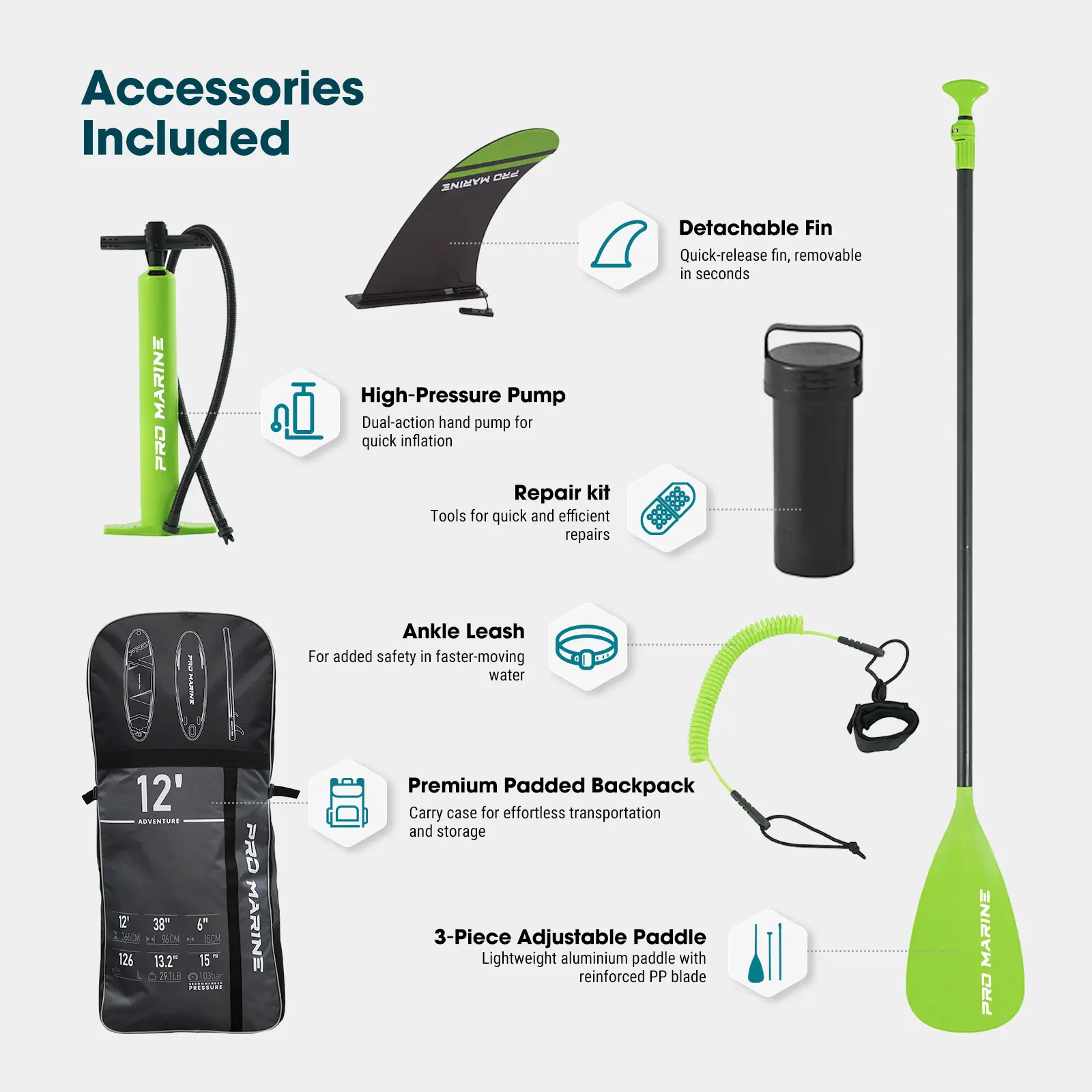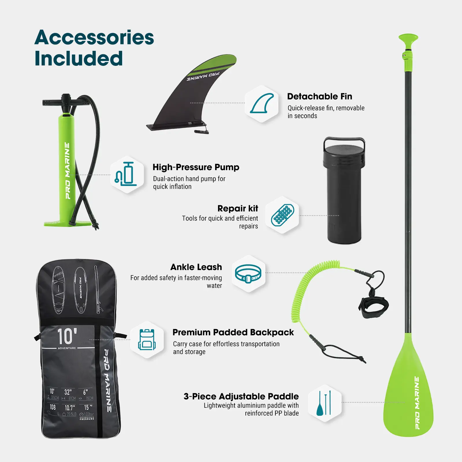 ·Package included:1 x Paddle Board1 x Paddle1 x Pump1 x Backpack1 x Coil Ankle Leash3 x Removable Fins1 x Repair kit