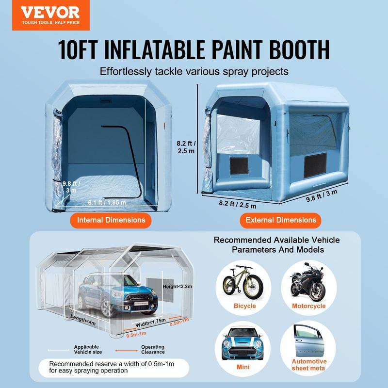 ·Multi-Purpose: The 10ft portable inflatable paint booth is suitable for painting and repairing bicycles, motorcycles, small furniture, car parts, metal products, and more. It can also serve as a temporary space for exhibitions, outdoor camping, and medical assistance.