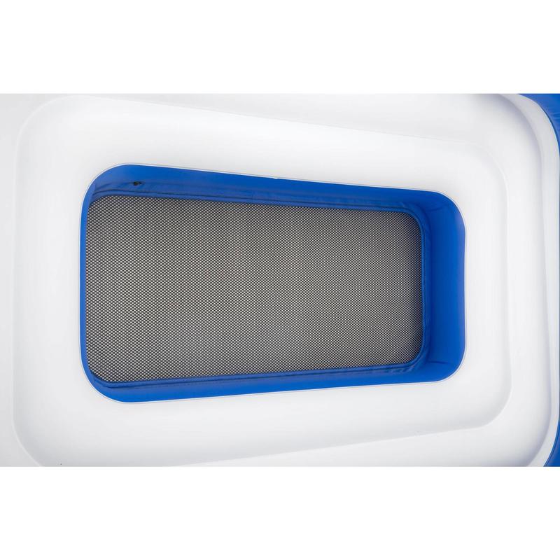 The Hydro-Force Tropical Breeze Party Island Float fits up to 6 adults, measuring 12.75 ft deep, 9 ft wide, and 2 ft tall. Made of durable PVC, it features a detachable sunshade, mesh floor, 6 cup holders, a built-in cooler bag, and supportive backrests. Weight capacity: 1,188 lbs. Ideal for lakes, rivers, or oceans. Color: Blue/White. Dimensions: 153" x 108" x 29".