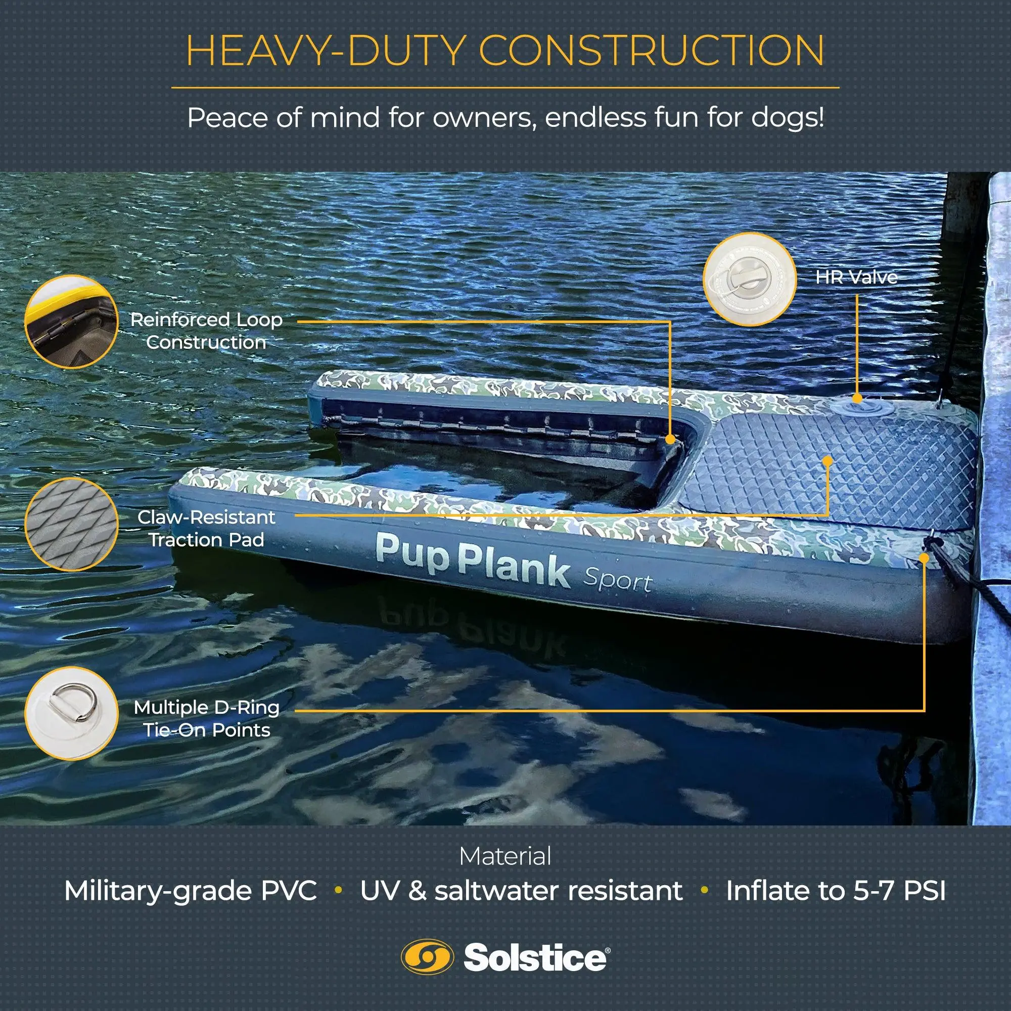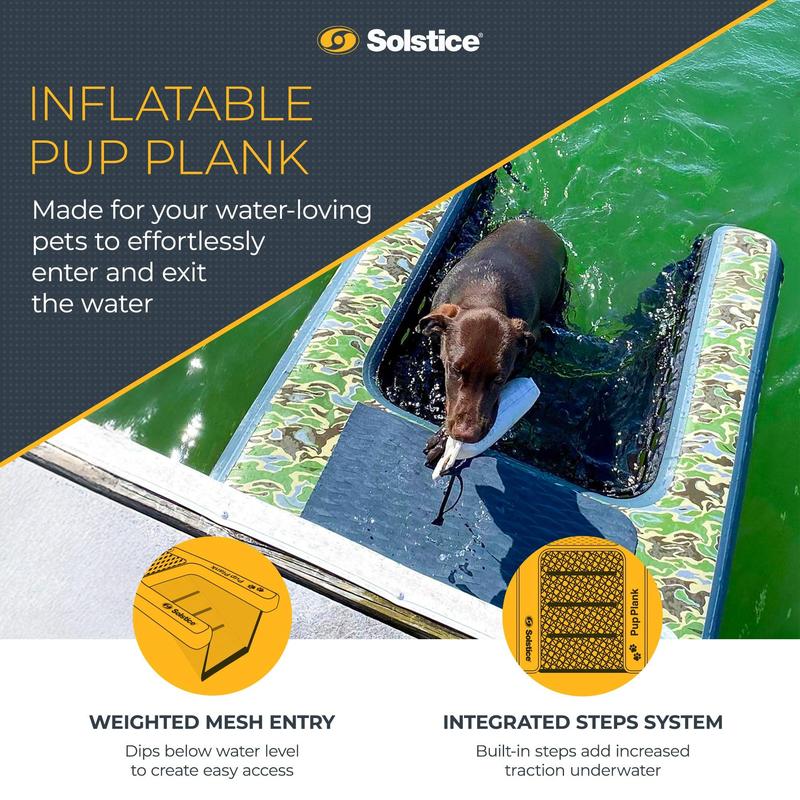 Make water adventures fun and safe for your furry friend with the Solstice Original Inflatable Pup Plank Dog Ramp.This innovative pet ramp provides a stress-free way for your dog to enter and exit the water, whether you're by the pool, on a boat, or relaxing at the dock. Featuring a thoughtfully designed weighted mesh, this safety ramp effortlessly sinks below water level, creating a stable and secure entry point for pets of all sizes. Engineered for versatility, the Pup Plank features built-in D-rings and tie ropes, allowing easy attachment anywhere. Coming with a heavy-duty dropstitch construction, this dog floatie delivers unmatched stability, while the extra-dense EVA traction pad provides a soft and comfortable platform for your pet to rest or launch from. Designed to accommodate dogs up to 200 pounds, its extra-large 48 by 32 by 5-inch surface ensures ample space for all breeds. Incredibly portable, this dog ramp weighs just 12 pounds, folds down neatly, and fits in the included carry bag for easy storage and transport. Inflate, deflate, and pack it up in minutes—perfect for road trips and spontaneous outings. The package includes a pump, carry bag, and repair kit, giving you everything you need for a trouble-free experience.The Solstice Inflatable Pup Plank is your pet's ultimate companion for aquatic fun.
