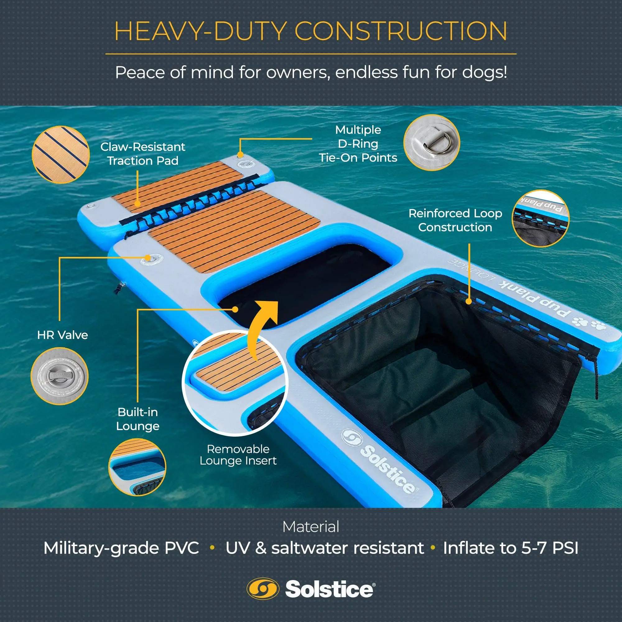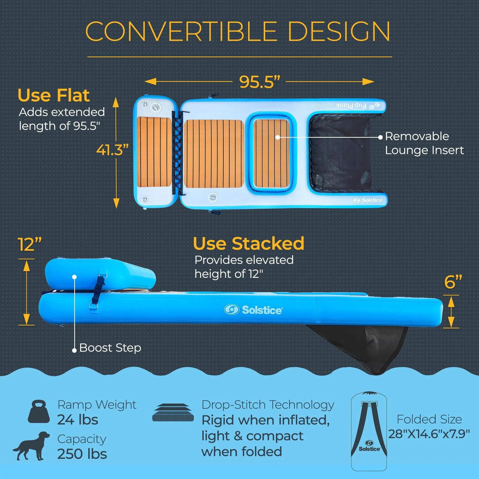 Introducing the SOLSTICE Inflatable Pup Plank LOUNGE – the ultimate multi-purpose water ramp and lounge for your furry friends. Designed for pools, boats, and docks, this new model combines the functionality of our classic Pup Plank BOOST with an innovative built-in lounge area, perfect for pets to relax, cool off, and enjoy the water. With the ability to support pets up to 250+ pounds, the Pup Plank LOUNGE is ideal for dogs of all sizes.The LOUNGE model features an integrated steel-bar weighted mesh and sewn-in steps that sink below water level, providing an easy entry and exit point for your pet. The built-in lounge is designed for maximum comfort and versatility, complete with a removable insert that allows you to transform the surface into a flat platform when needed. Whether your pet wants to rest in the lounge or have a stable climbing surface, this feature ensures adaptability for every water adventure.From high swim platforms to tall docks, the Pup Plank LOUNGE is perfect for any swimming environment. Its stable design, innovative features, and premium materials make it the go-to solution for ensuring your pet’s safety, comfort, and enjoyment in the water.Despite its robust features, the Pup Plank LOUNGE offers superior portability and easy storage. Its easy-to-inflate, deflate, fold, and store design is perfect for tight storage spaces - say goodbye to bulky metal ladders or water ramps.Constructed with dropstitch inflatable technology, the Pup Plank BOOST promises a rigid feel when inflated, ensuring durability and stability. The extra-dense, claw-resistant EVA traction pad provides extra grip and comfort during use.Designed by the team at Solstice in NY, the Inflatable Pup Plank series is an original, so beware of look-alike items! We adhere to rigorous development and quality control processes to ensure we deliver only the best for our customers.The Pup Plank BOOST is the ultimate investment for pet owners seeking the best pool ramp solution.