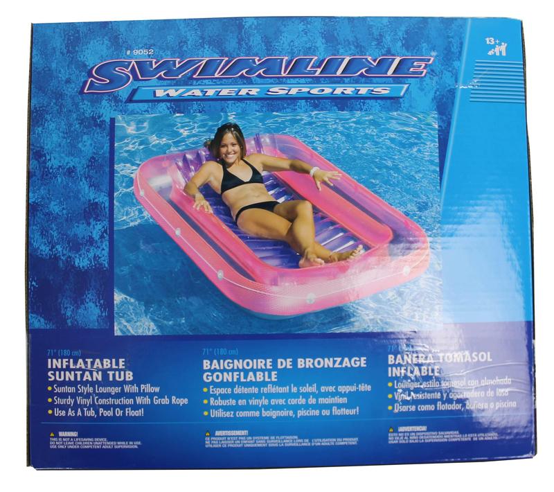 Stay cool this summer with the Swimline suntan tub float lounge. It features a comfortable pillow design and durable vinyl construction with a grab rope. This versatile float functions as a tub, pool float, or even a cooler for poolside gatherings. Add water for an extra cool ride! Dimensions: 70" x 46" x 8".