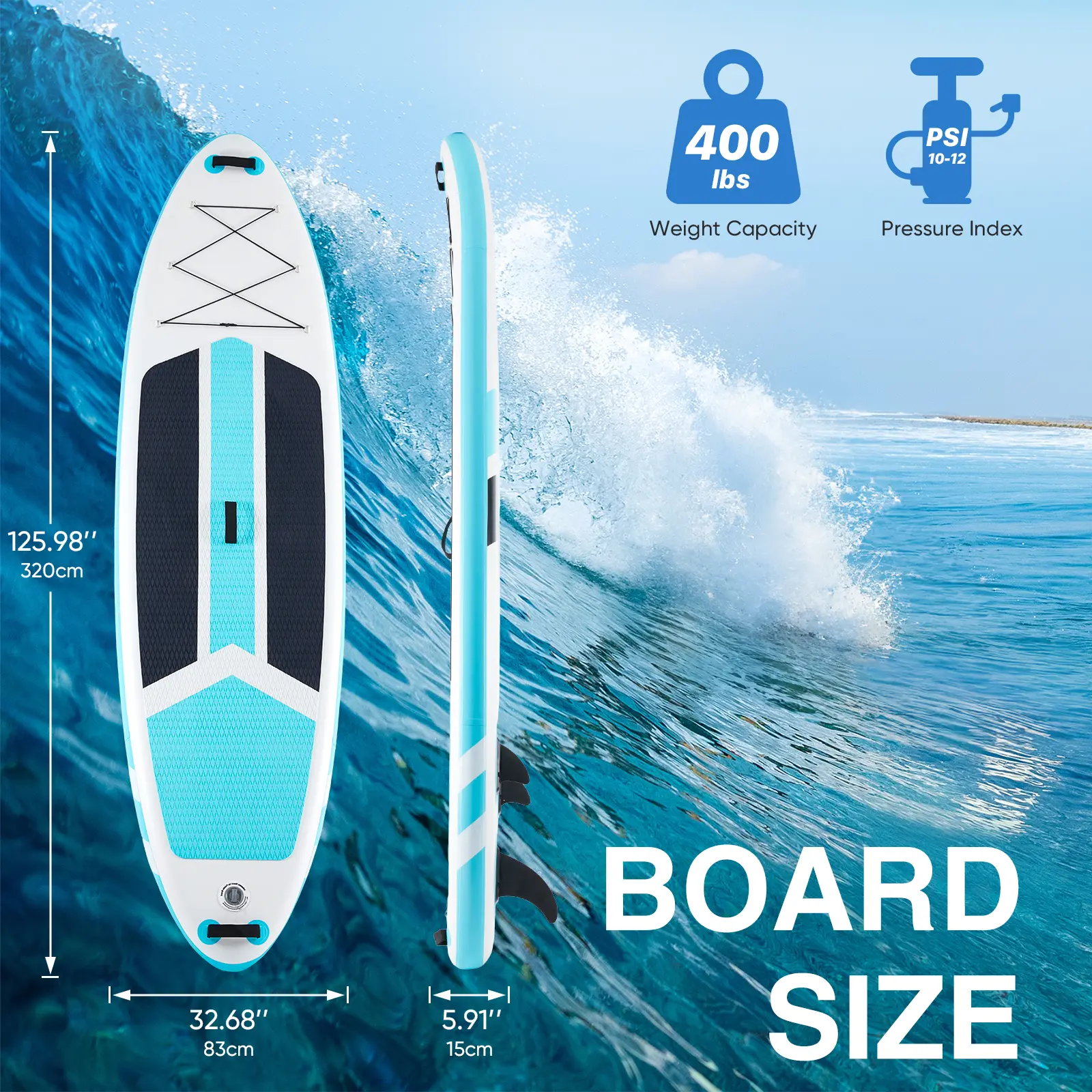 ·【Great Durability】Our standup paddle board inflatable measures 126x33x6 inch and can support up to 400lb of weight. The paddle board is is built with high-pressure construction and commercial-grade PVC material, ensuring outstanding durability and preventing leaks for long-lasting enjoyment.