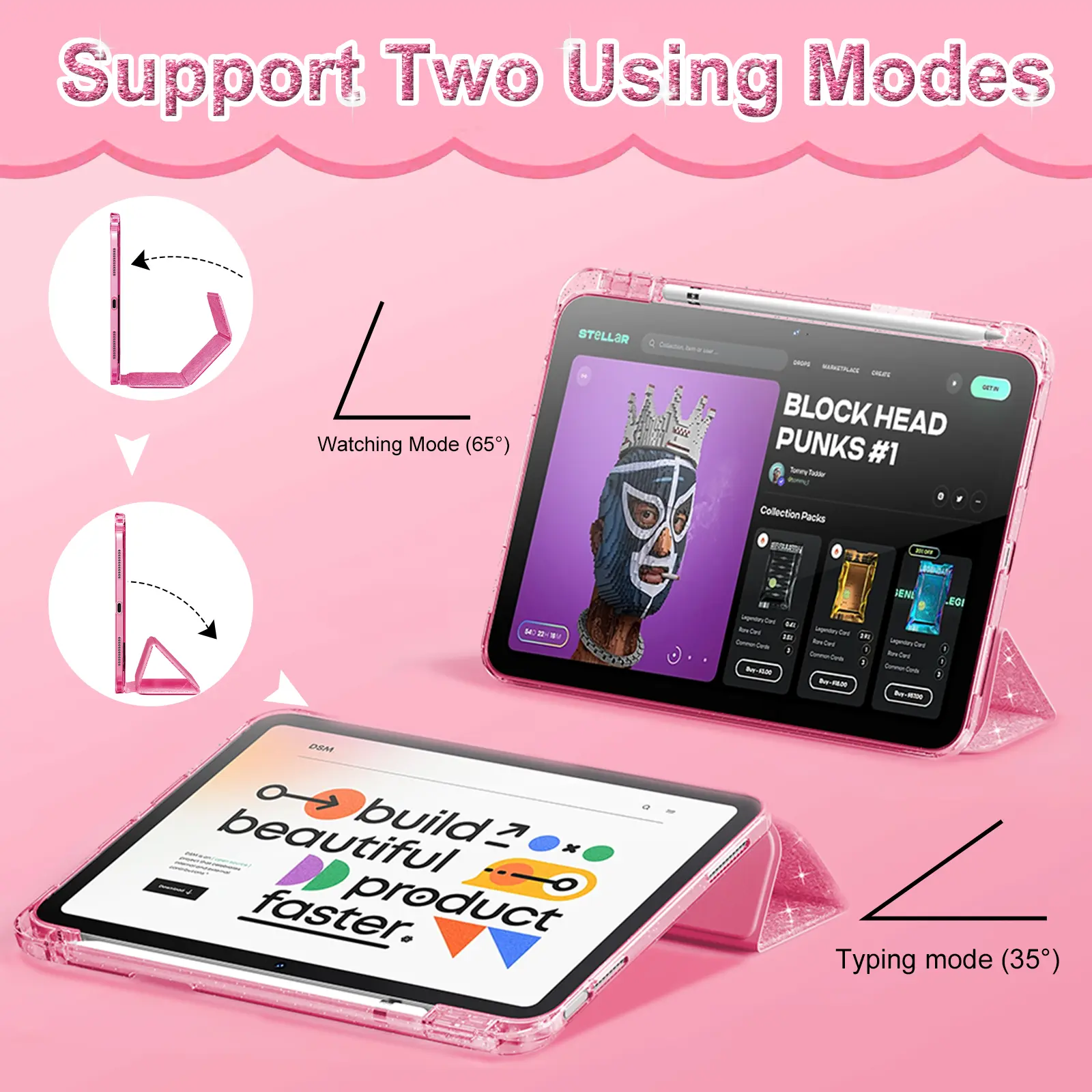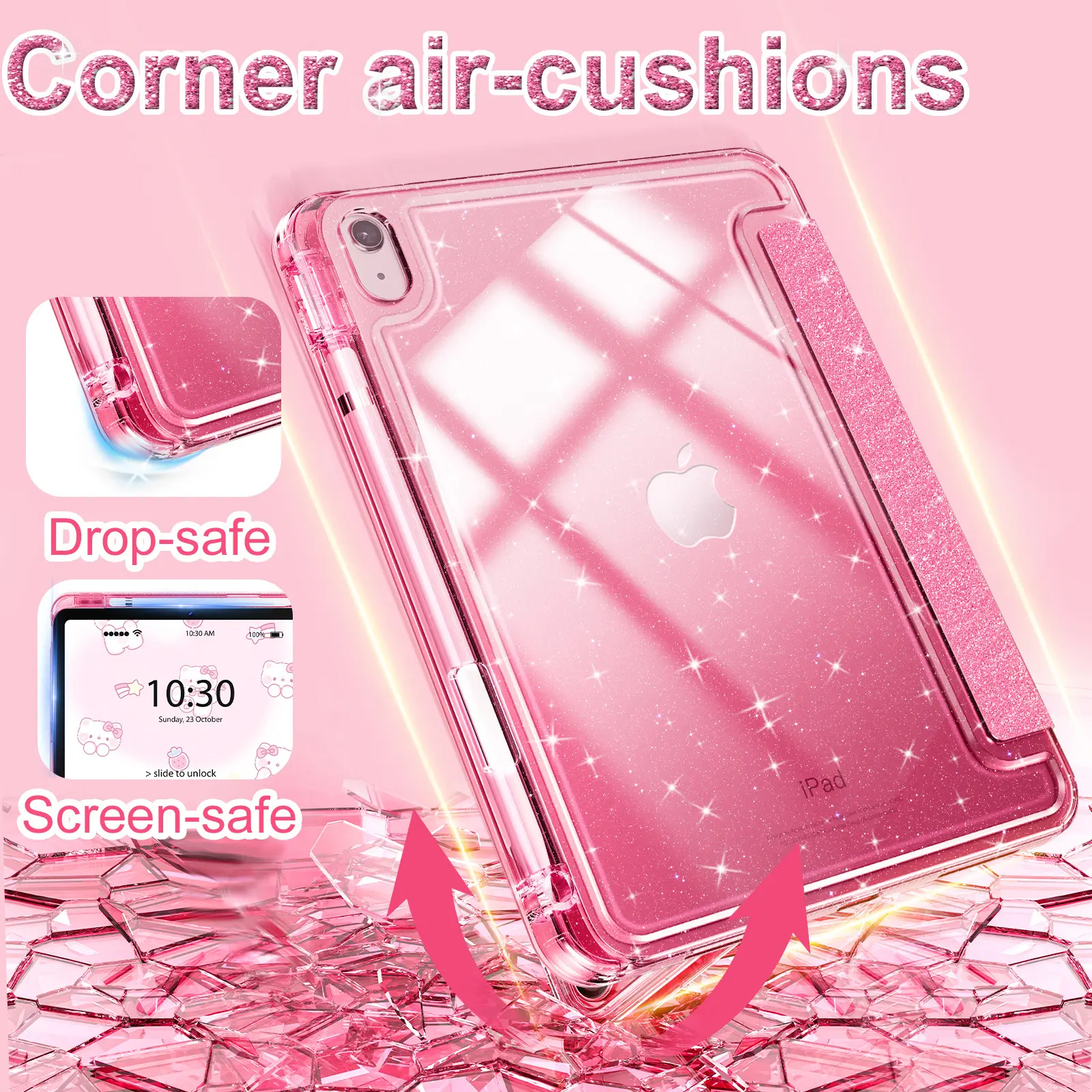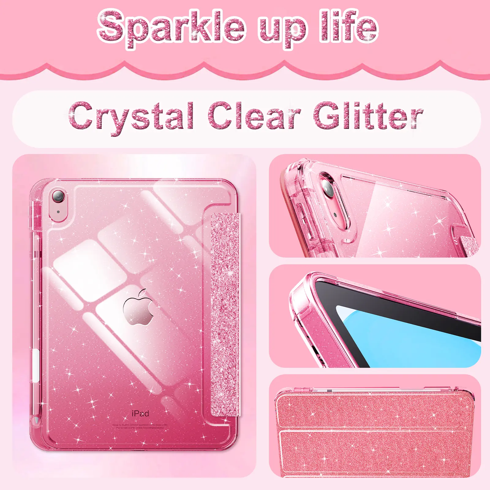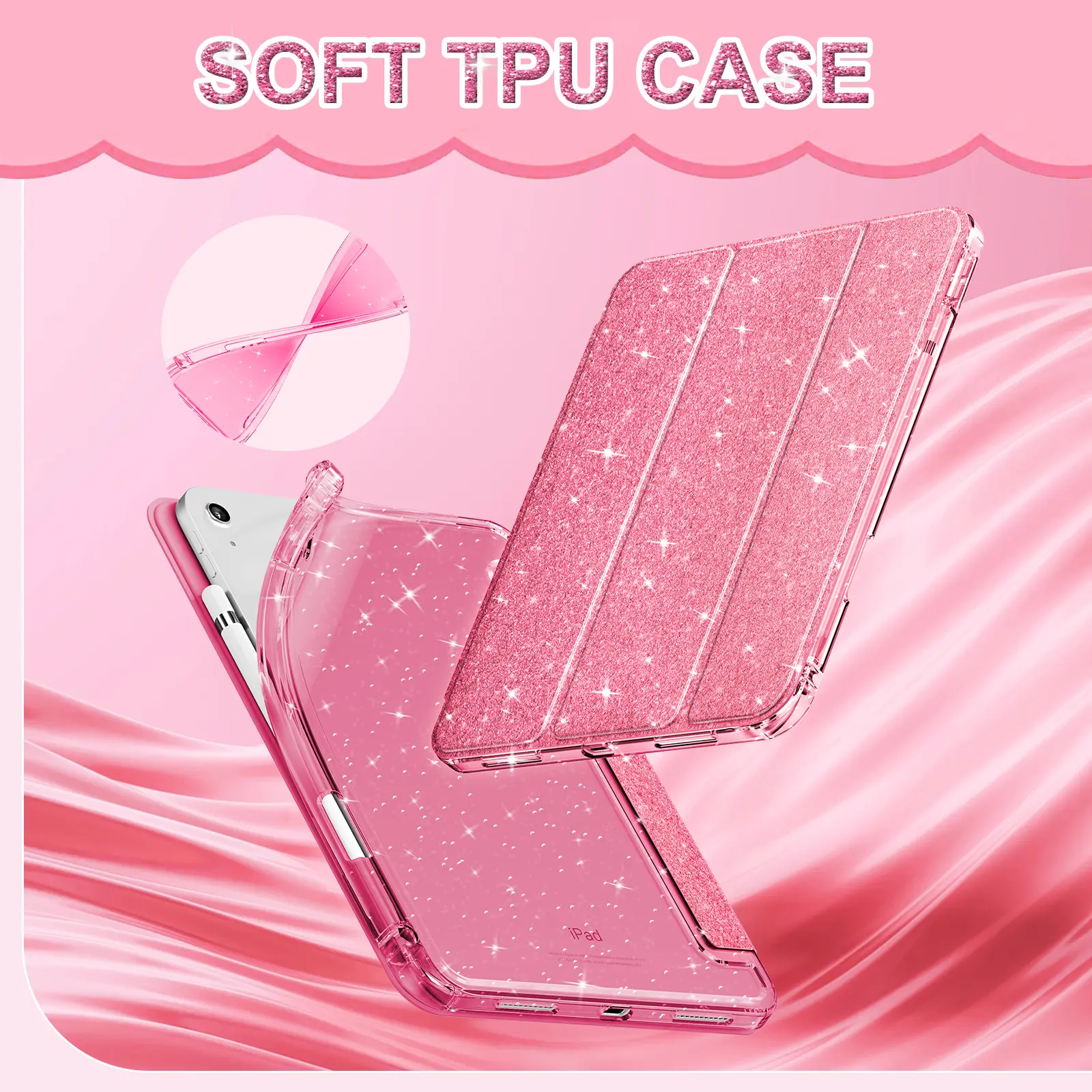 Combine glitter and clear materials, this case focuses on highlighting your iPad's elegance. The glitter adds a touch of sparkle, making it stand out. It's ideal for those who love a unique look. The case ensures your iPad looks stylish while protecting it from daily wear and tear.
