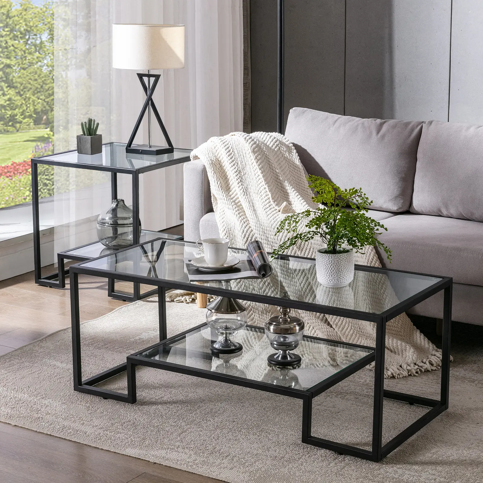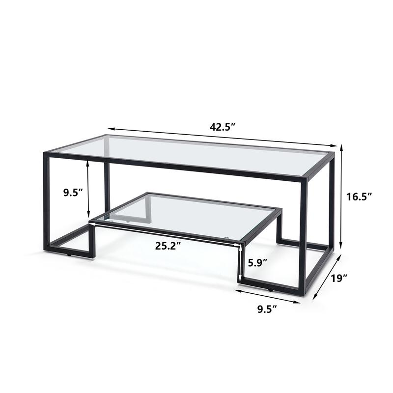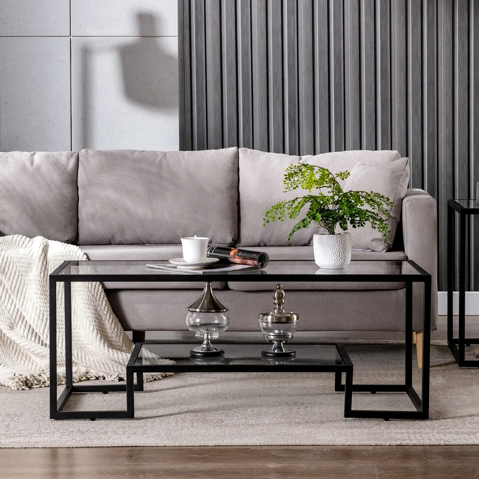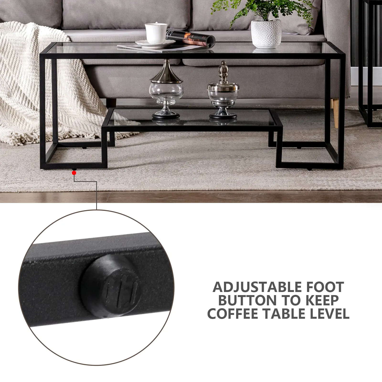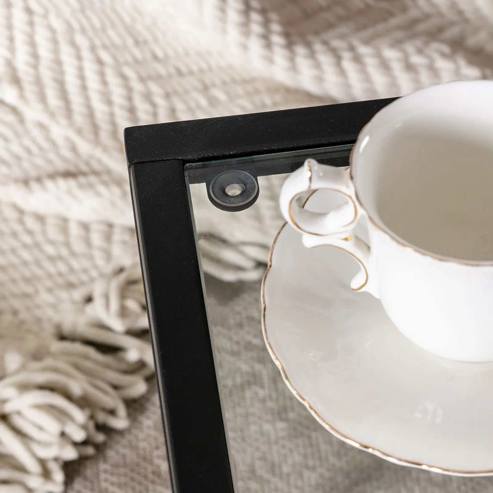 Modern Metal Glass Coffee Table Black Accent Tempered Glass Side Table with Storage Shelf for Living Room & Office Decor