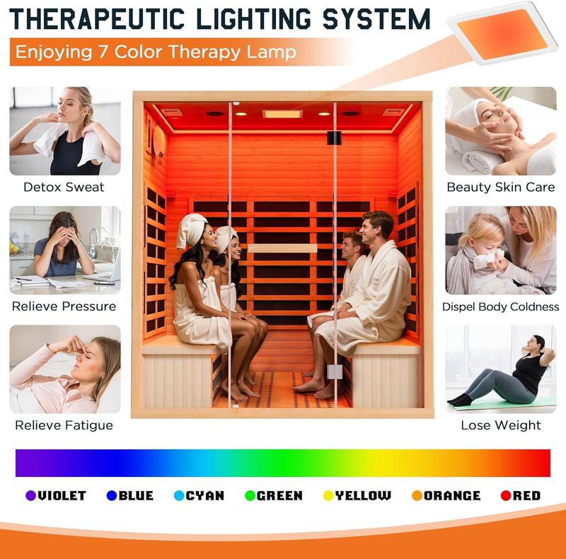 7-Color Mood-Boosting Light Therapy: From calming blue for sleep to energizing red for vitality, each color supports emotional balance through science-backed chromotherapy—enhanced by surrounding LED light strips that create a relaxing ambiance in your infrared sauna