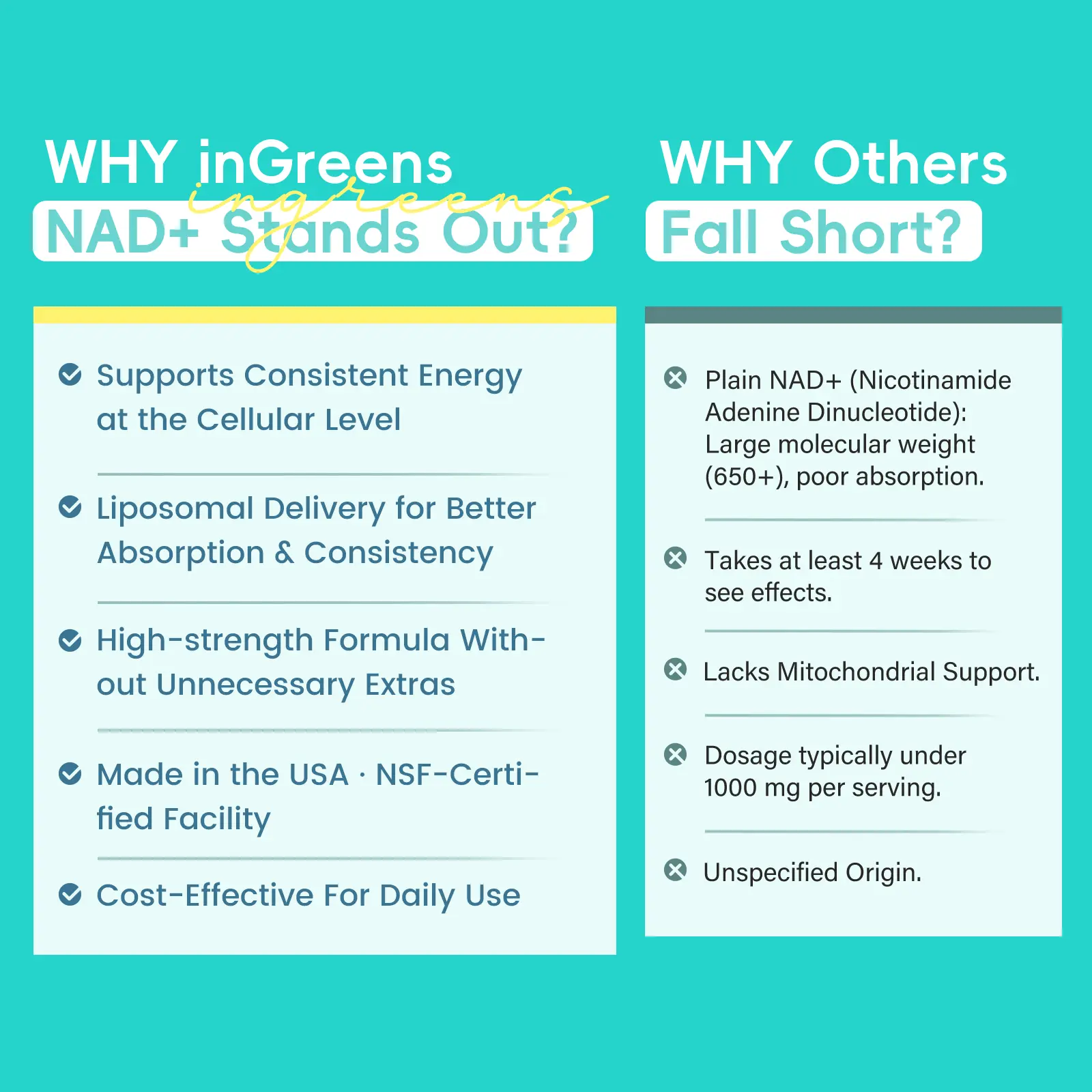 ·Premium Anti-Aging:inGreens NAD⁺ 1800 embodies decades of cellular health research, offering a scientifically-driven premium anti-aging solution. Trusted globally by health enthusiasts, we uphold uncompromising quality standards to restore youthful vitality from within.