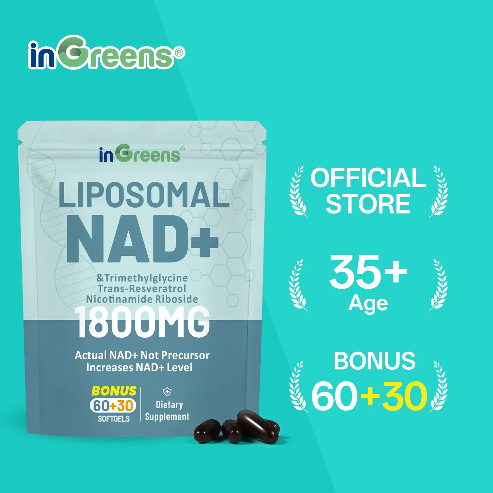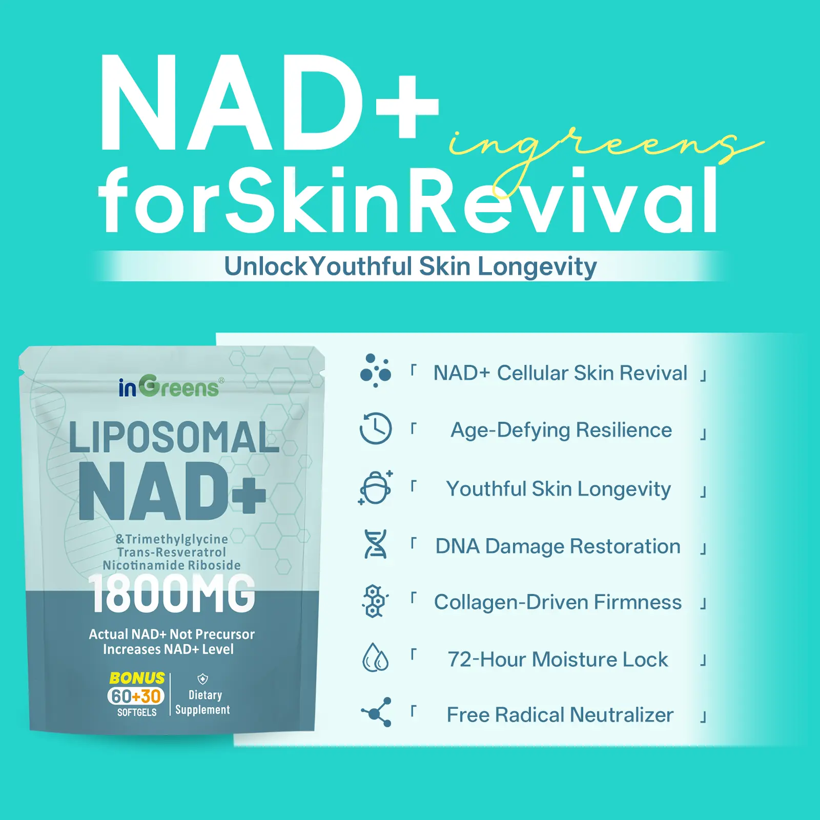 ·Scientific NAD⁺ Supplementation Formula: inGreens NAD⁺ 1800 delivers 1200 mg of liposomal NAD⁺ synergized with 200 mg trimethylglycine, 200 mg trans-resveratrol, and 200 mg nicotinamide riboside (NR). This advanced formulation is designed to directly replenish intracellular NAD⁺ levels, activate longevity-associated pathways such as SIRT1, and target oxidative stress, DNA repair, and mitochondrial energy production. Leveraging cutting-edge liposomal technology for rapid absorption, it promotes anti-aging benefits for skin, hair, and nails while enhancing systemic vitality.