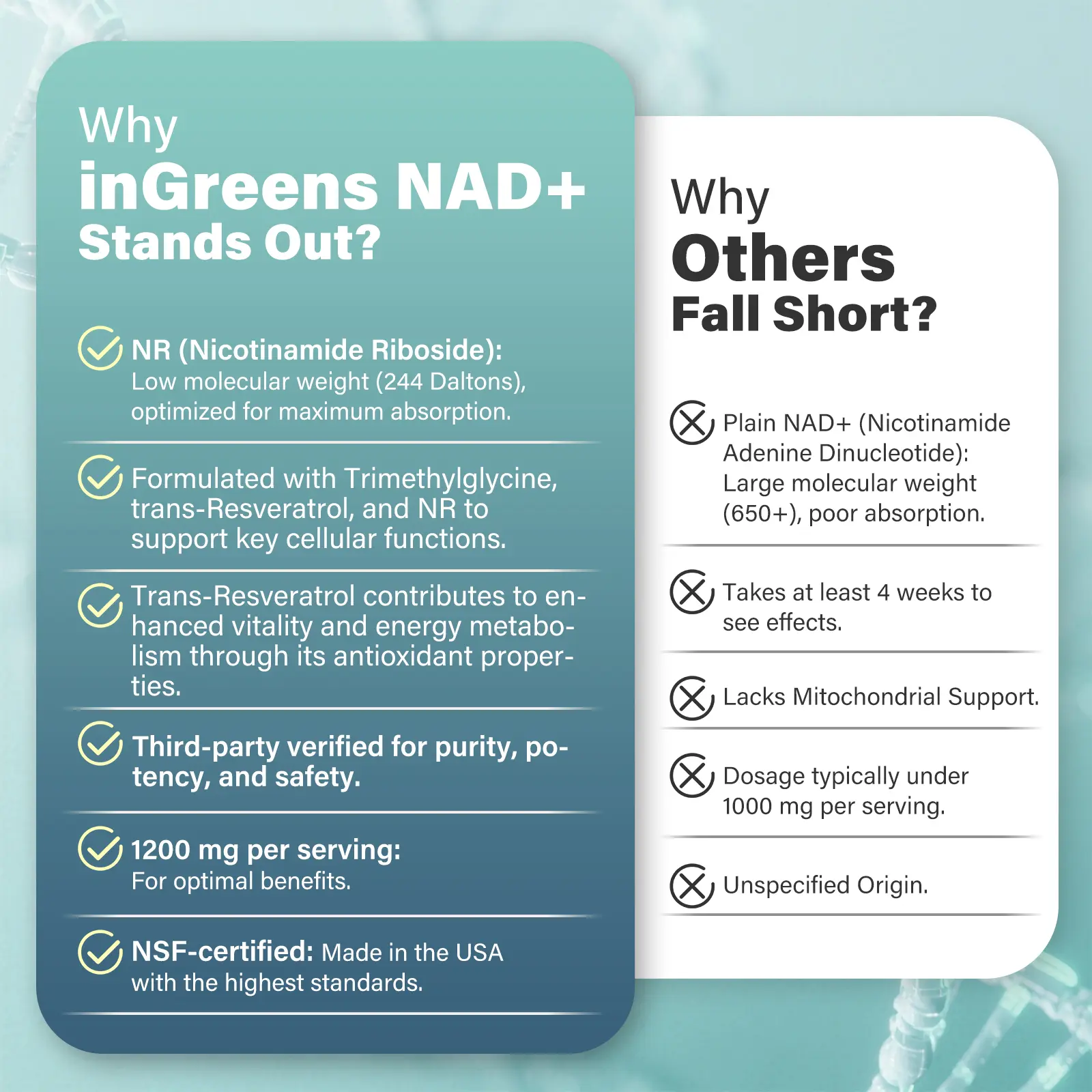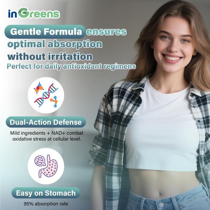 ·Premium Anti-Aging:inGreens NAD⁺ 1800 embodies decades of cellular health research, offering a scientifically-driven premium anti-aging solution. Trusted globally by health enthusiasts, we uphold uncompromising quality standards to restore youthful vitality from within.