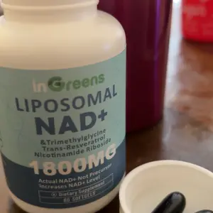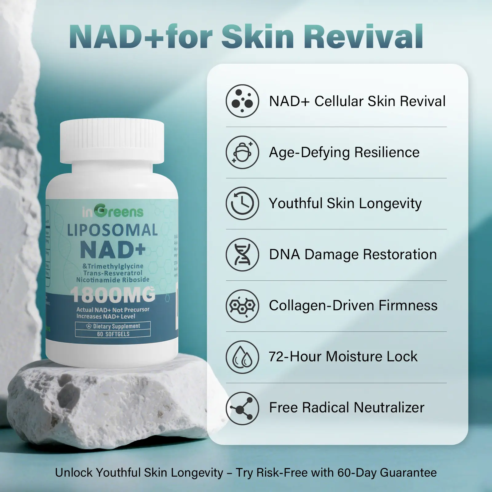 ·Scientific NAD⁺ Supplementation Formula: inGreens NAD⁺ 1800 delivers 1200 mg of liposomal NAD⁺ synergized with 200 mg trimethylglycine, 200 mg trans-resveratrol, and 200 mg nicotinamide riboside (NR). This advanced formulation is designed to directly replenish intracellular NAD⁺ levels, activate longevity-associated pathways such as SIRT1, and target oxidative stress, DNA repair, and mitochondrial energy production. Leveraging cutting-edge liposomal technology for rapid absorption, it promotes anti-aging benefits for skin, hair, and nails while enhancing systemic vitality.